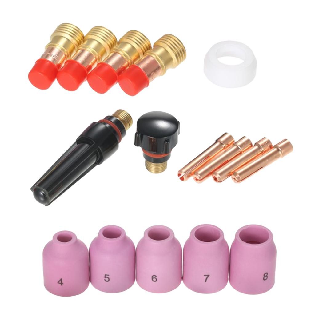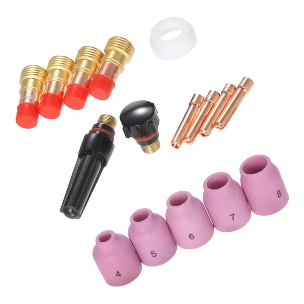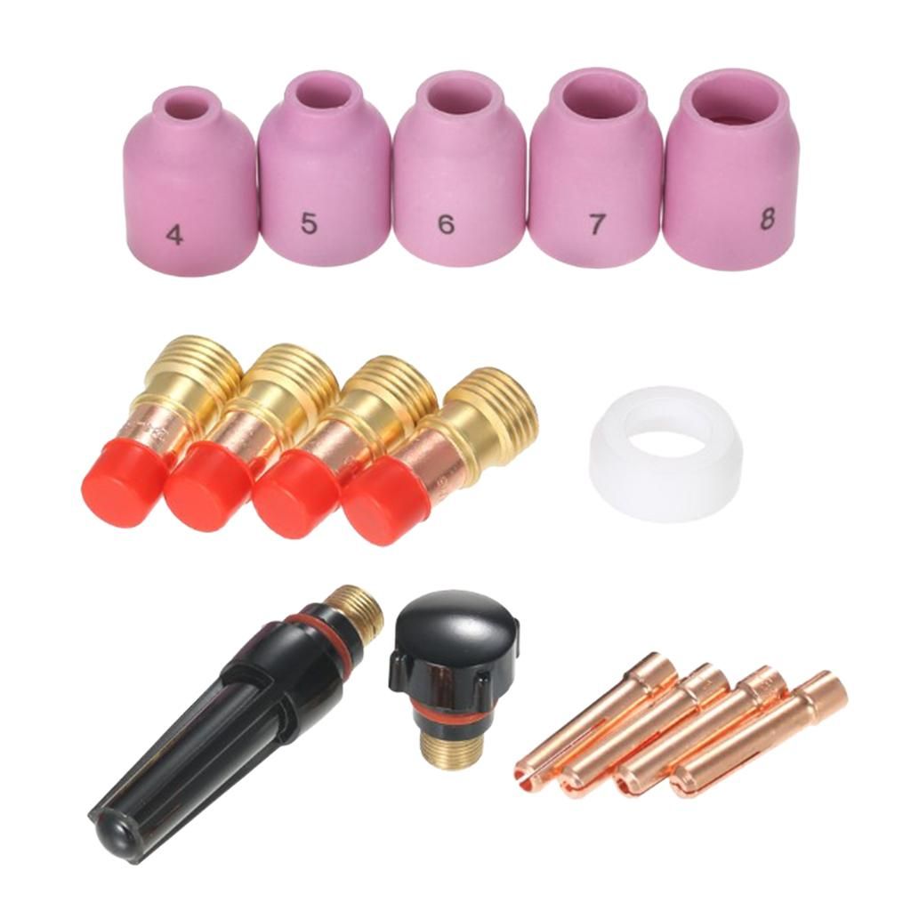 5 Pieces TIG Ceramic Alumina Nozzle Gas Lens4 Pieces TIG Gas Lens Collet Bodies4 Pieces TIG Collets2 Pieces TIG Back cap1 Piece Insulators gasket