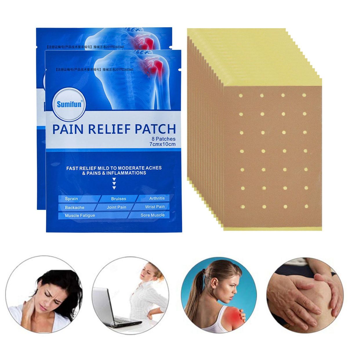 Main Ingredients : Wormwood , Reticulate millettia , saline cistanche , davallia mariesii , etc Quickly relieve various pains associated with muscle strain , neck pain , rheumatic arthritis , hyperostosis , knee joint ache , tenosynovitis , strain & amp ; sprain , , fibromyalgia . Necessary for office workers , popular in hotweather and warm areas 2 bags pack , each bag contains 8 , total 16 Waterproof and sweat proof , multiple holes keep skin breath . Good air permeability and water permeability , avoid the skin soakage in along - term use