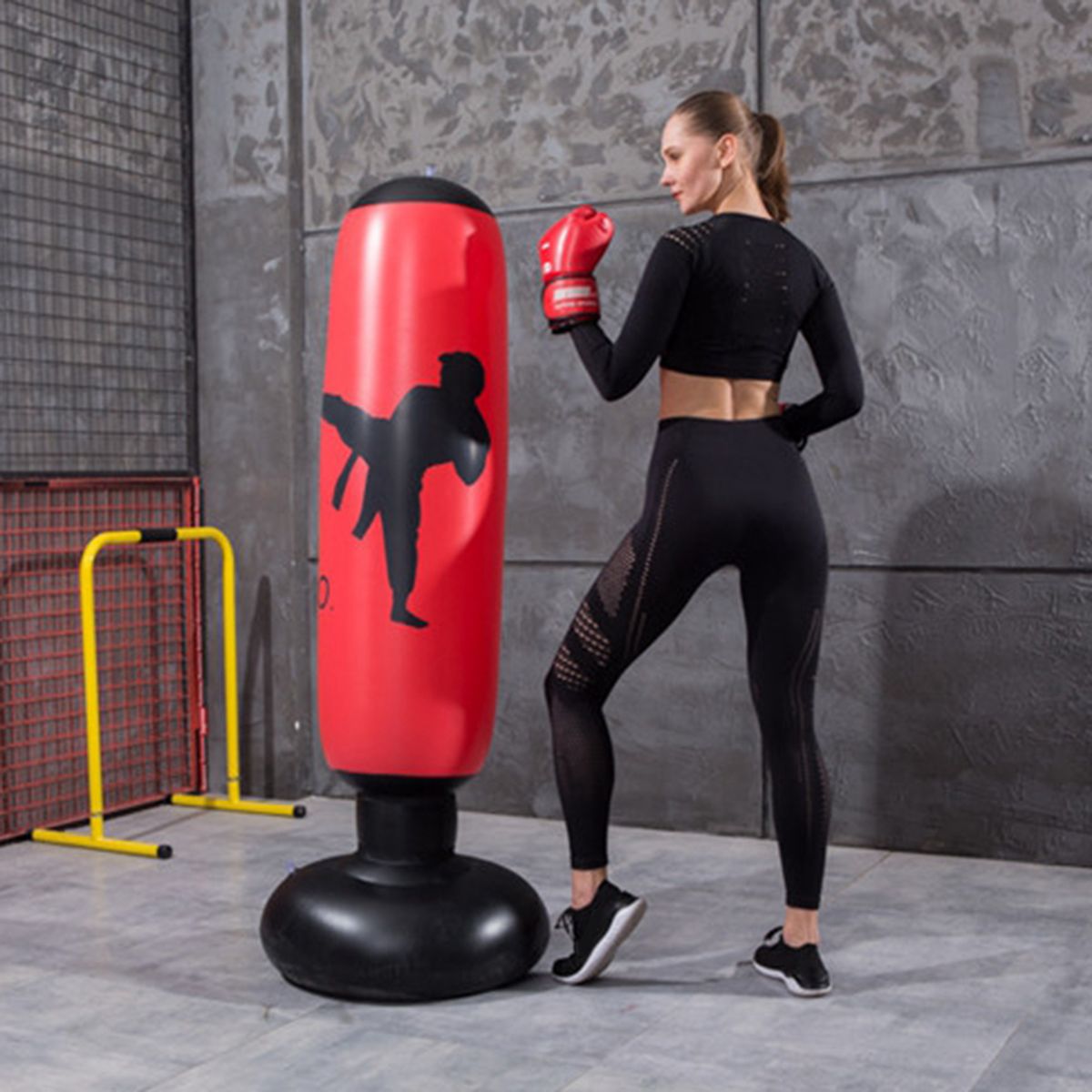 160x65cm inflatable pounching bag free standing punch sandbag made of premium PVC material, safe, environmentally friendly and durable Thickened base, diameter 65cm very stable for better using experience.Easy to inflate and deflate, can be folded into small size for storage, convenient to use.Soft air punching bag absorbs shock and protects you from accidental injury for women, men, kids It is an boxing training accessory, good for relieving pressure, body building, etc, easy to exercise anywhere, suitable for home, courtyard and gym, etc.