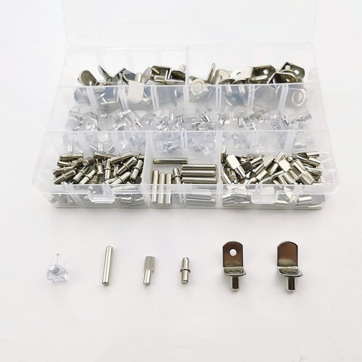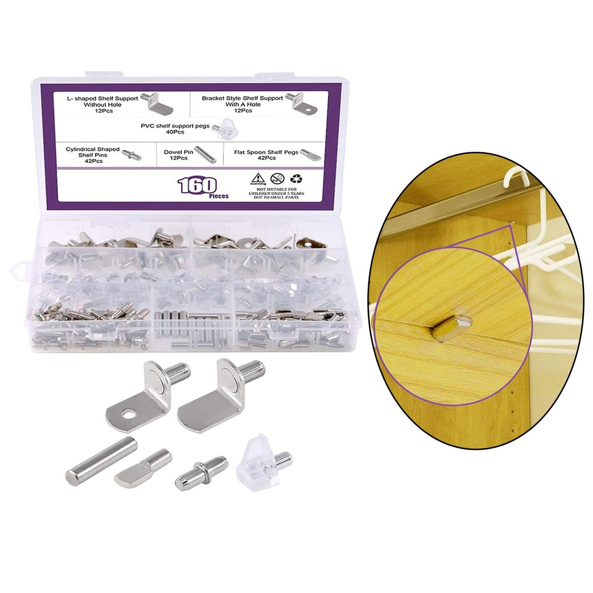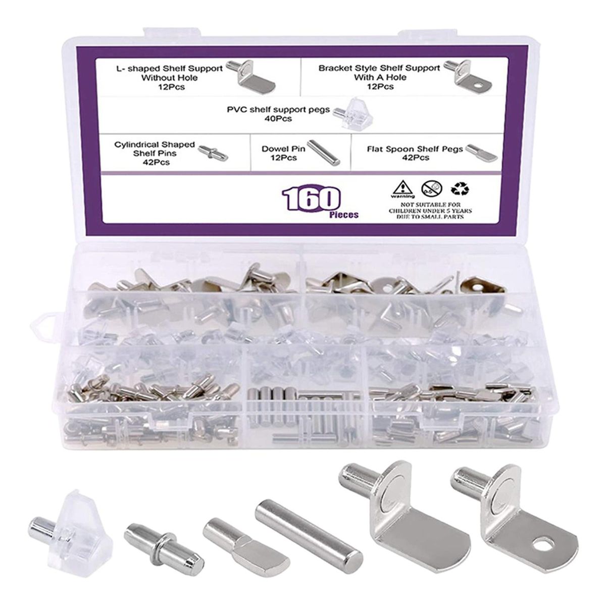 In this , You will get 12pcs × L Shaped shelf support without hole; 12pcs × Bracket shelf support with hole; 12pcs × Dowel Pins; 40pcs × PVC shelf support pins; 42pcs × Cylindrical Shaped Shelf Pins; 42pcs × Flat spoon shelf pegs. In toatl 160Pcs in a box.