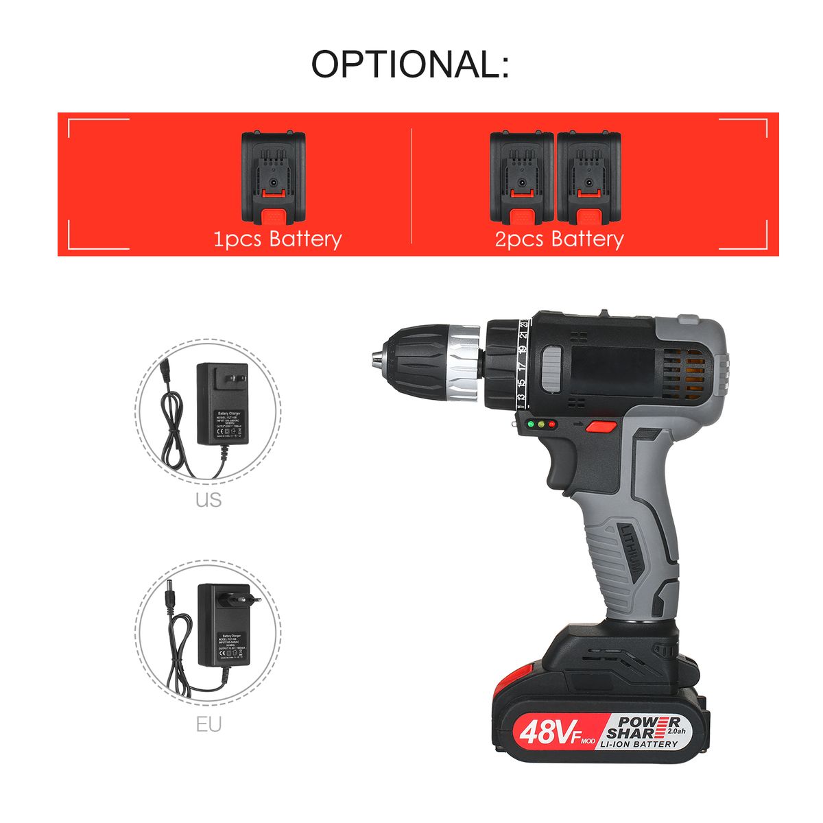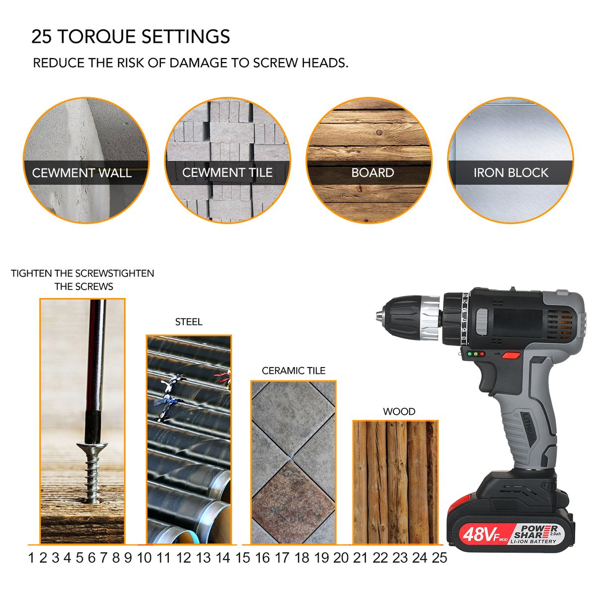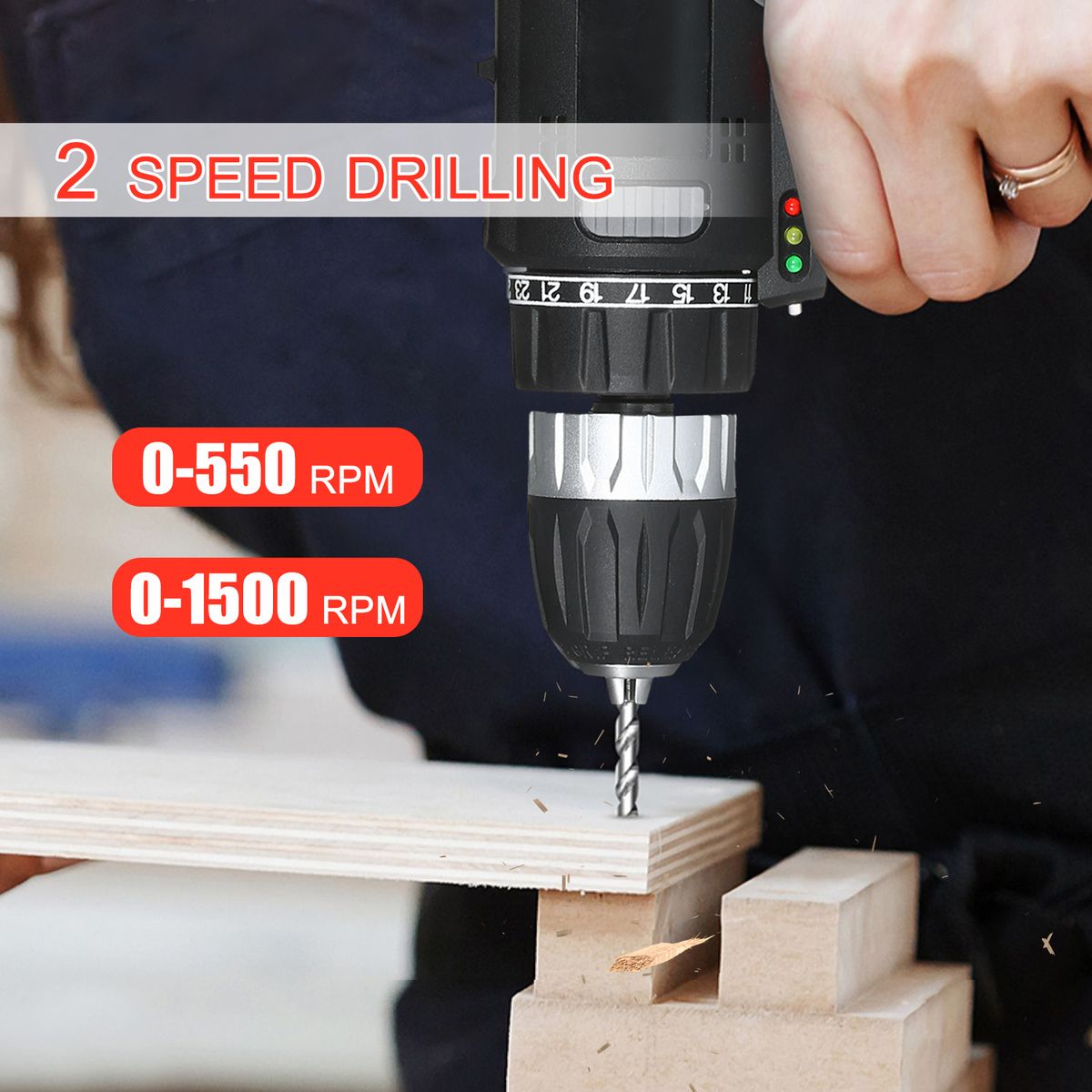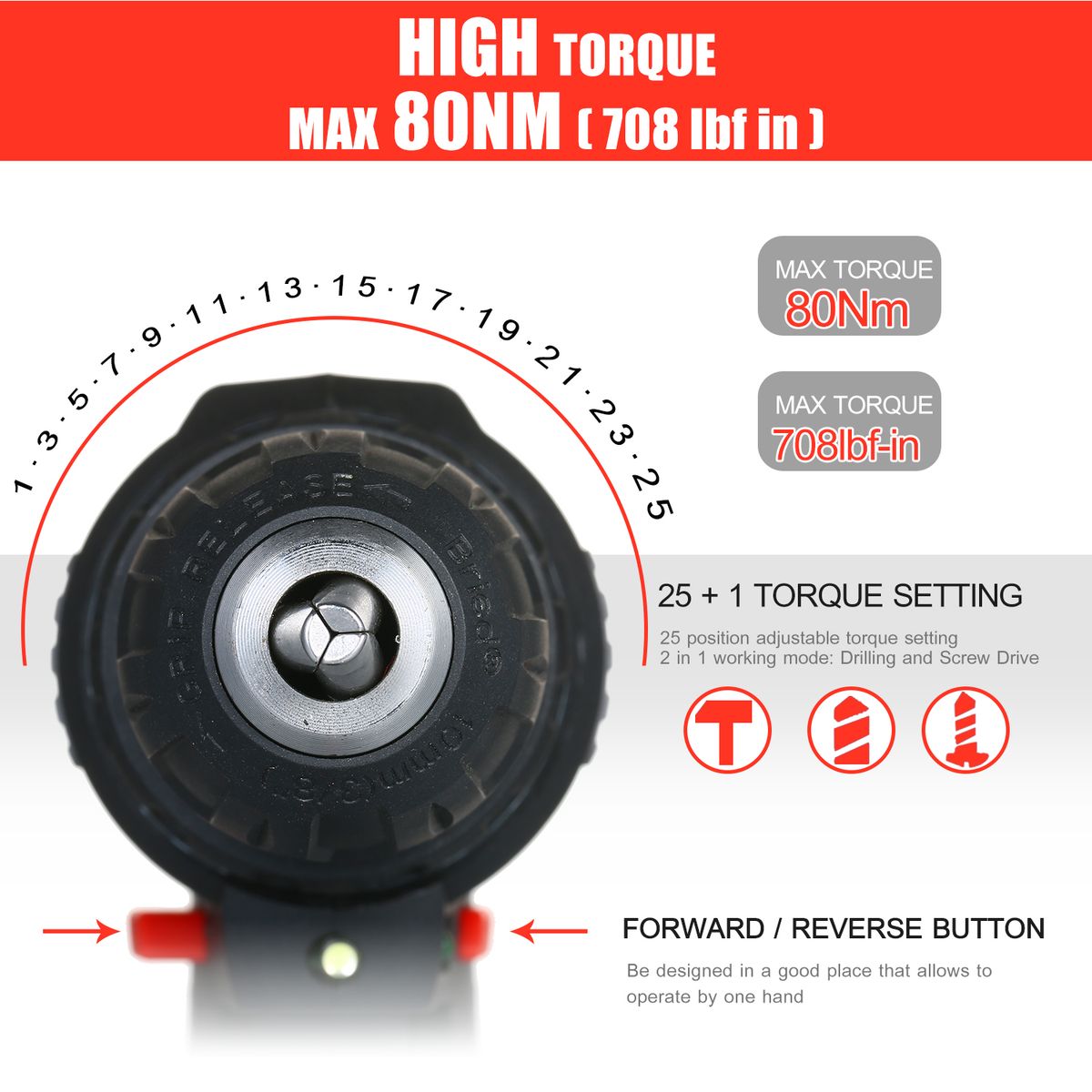 2-Speed Mode Accurate Control --- The variable speed trigger allows for precise speed control. Besides, the cordless drill has a 2-speed setting button, Low Speed(0-350RPM)for screwdriver, High Speed(0-1500RPM) for drilling. 25 adjustable position clutch with the max 80N.m torque which offers powerful power for drilling wood plastic board.