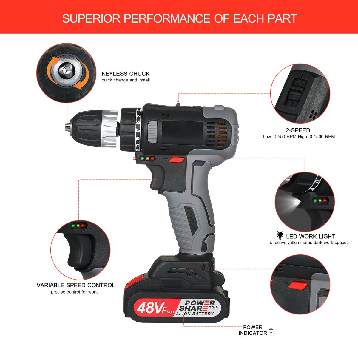 High Performance --- Features 3/8in(10mm) keyless ratcheting chuck provide maximum durability and great accessory compatibility, 160W 80N.m powerful torque is ideal for drilling through or screwing in wood steel board/red brick/cement wall/wing nut, fulfilling a wide range of needs.