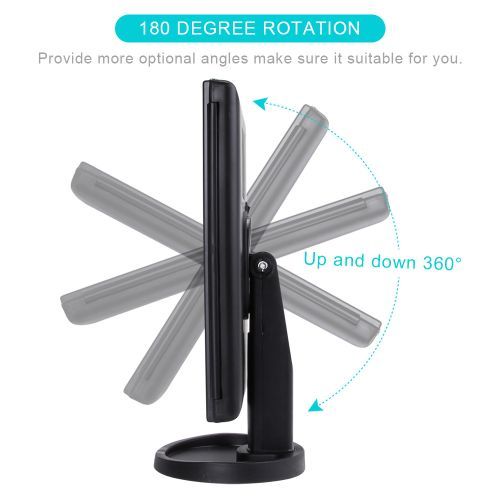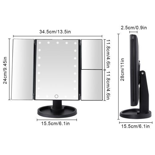 Features: Can stand in a flat position Use battery Or USB cable The material used is not easy to damage Unlimited gear touch screen intelligent switch Open can be stopped at various angles to use Full range of illumination without dead angle 22 LED lights, can adjust the brightness. In a dark place can clearly reflect your appearance Easy to operate a powerful switch, the ability to adapt to different light, different light environment. Can find the light intensity that you need in touch screen intelligent switch Installing the batteries: Remove the battery cover on the back of the mirror Insert 4 x AA batteries in the direction indicated inside the battery compartment Be sure to insert the battery correctly ( +/ -) Replace the battery cover Instructions for use: To turn on, move the switch on the back of the mirror to ON Firmly press the circle on the front of the mirror, the lights will be illuminated Press and hold the circle to reduce the light intensity Press the circle again to turn the lights off When not in use, move the switch on the back of the mirror to OFF This will save standby power consumption Attention: 4Pcs AA Batteries are not included!!! ? All the Accessories: 1 x LED Lights Makeup Mirror ? 1 x USB Cable 1 x Magnifying Glass ? We offer several sets, you can choose it on your actual requirement.