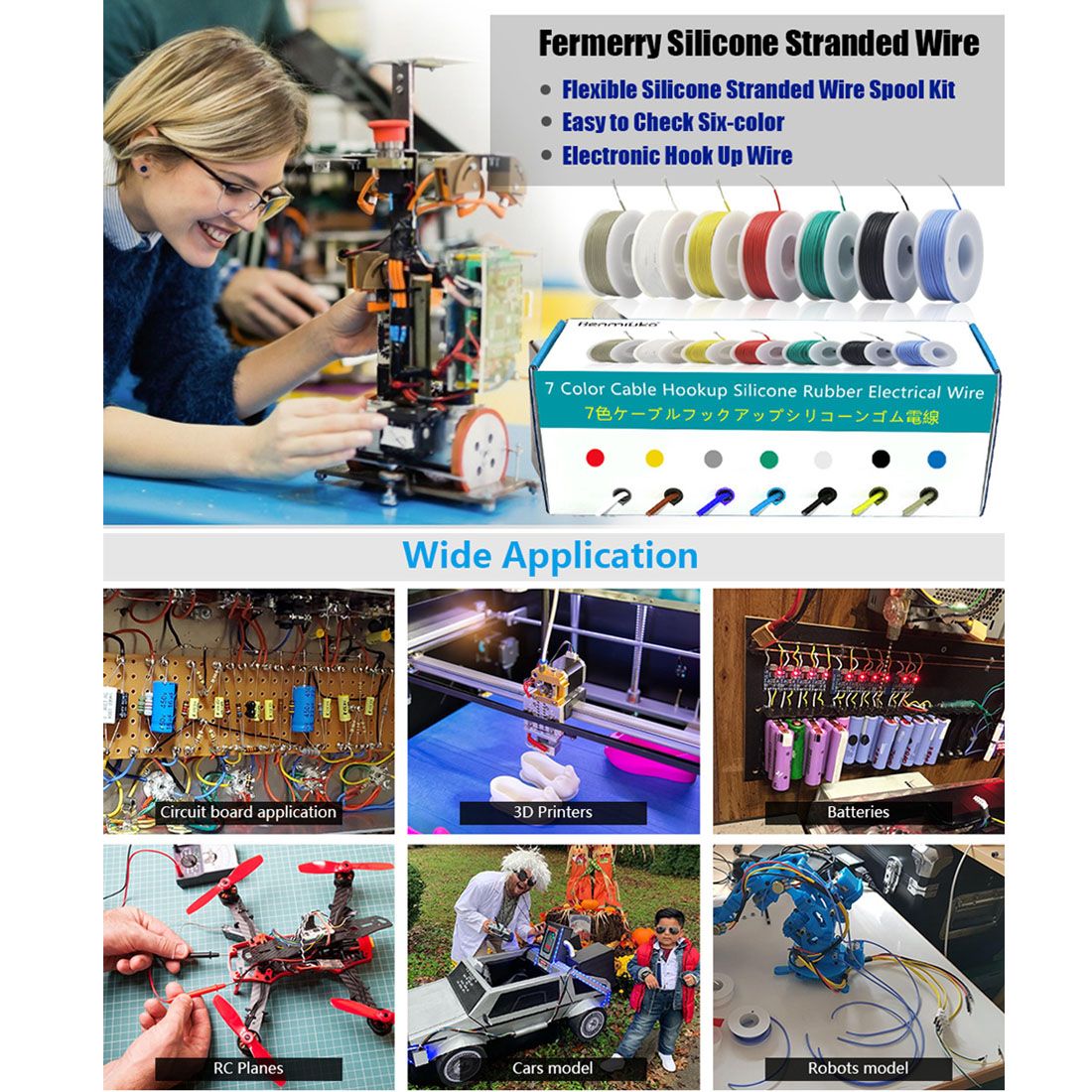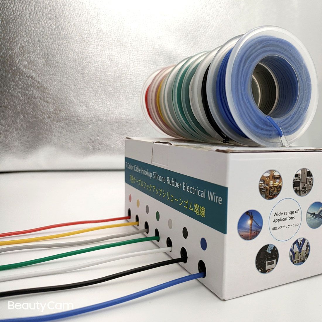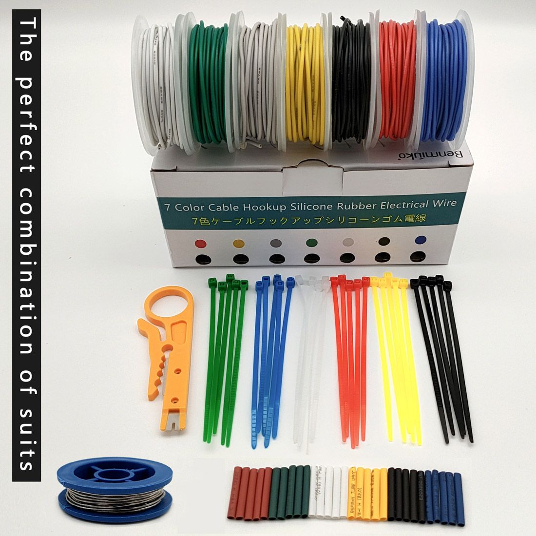 Silicone rubber wire, 7 color combinations: white, red, black, blue, green, yellow, gray.Comes complete with 2m of 6.5ft soldering wire, this kit also includes a heat shrink tubing kit, mini wire strippers, and colored clip wires for other everyday projects.