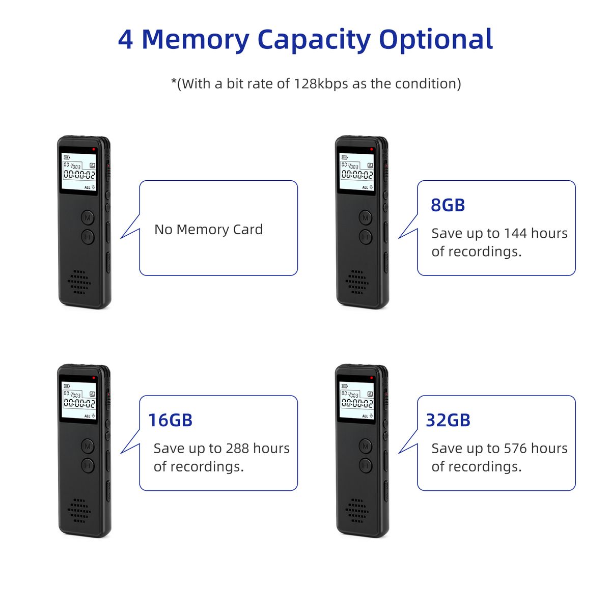 Features:Excellent Recording Quality - Built-in noise reduction microphone, MP3 format recording and 128kbps sound quality. You can buy memory cards with different storage capacity and insert it into the recorder to record(TF card is not included).