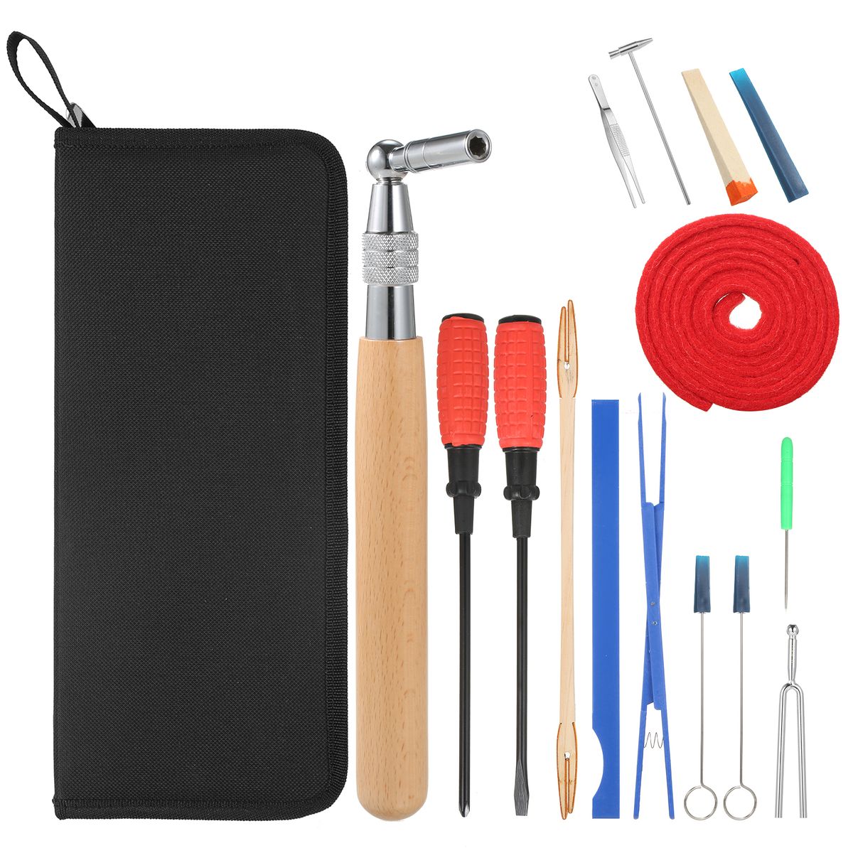 The Piano Tuning Kit including tuning wrench, tuning fork, stop clip, rubber mutes, screwdriver, hammer, tweezers, a roll of stop felt, etc.