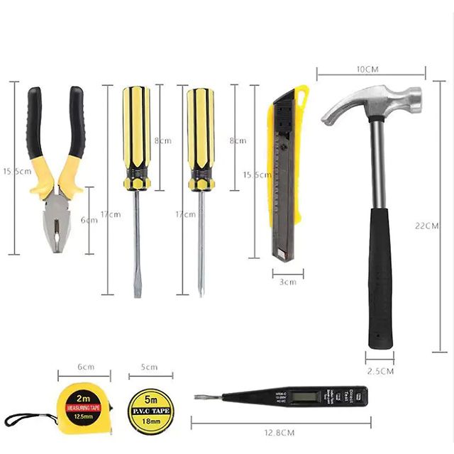 The set includes:1 × 7"Side cutting pliers1 × 8"Adjustable wrench1 × Utilityknife2 × Screwdrivers6*100(±)5 × Hex key(2-6mm)1 × PVC insulation tape1 × Digital electric tester1 × Tape measure(2M)1 × Claw hammer(8oz)1 × Screwdriver3*75(+)1 × Blow case