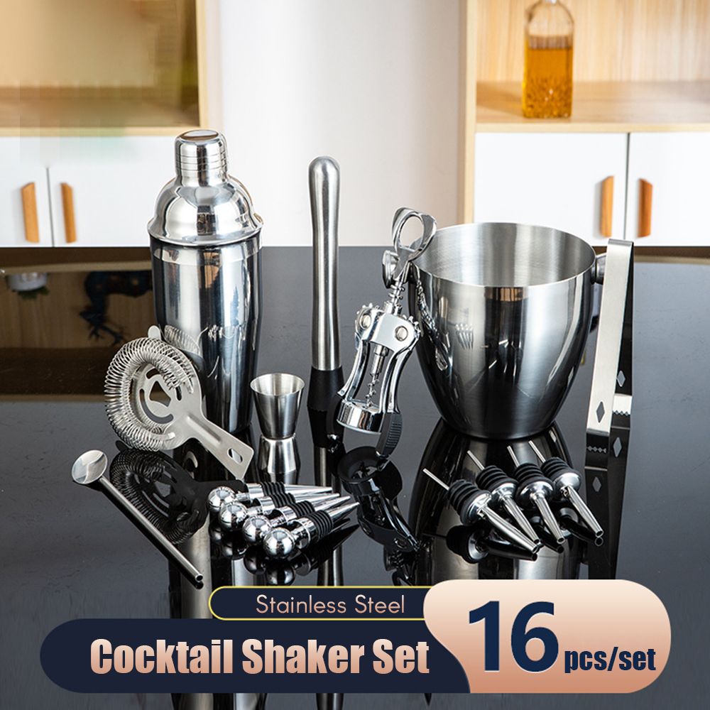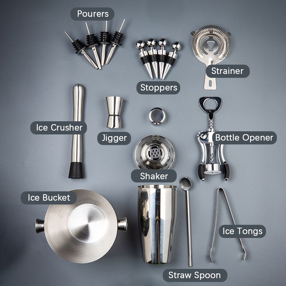 【Mixology Bartender Kit】16pcs/set, including 1 * shaker, 1 * double sided jigger, 4 * pourers, 1 * ice crusher, 1 * ice tongs, 1 * straw spoon, 1 * strainer, 1 * bottle opener, 1 * ice bucket, and 4 * stoppers, this mixology kit has everything you need to make craft cocktails.