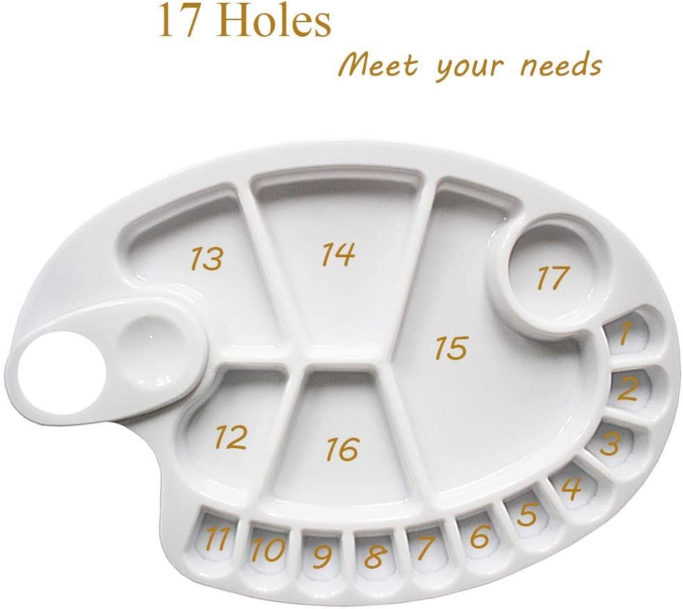 - Unique Design: 17 holes, 11 small wells, 1 big wells, 5 big central reservoir is suitable to separate or mix pigment, this acrylic paint palette is suitable for right-handed and left-handed use