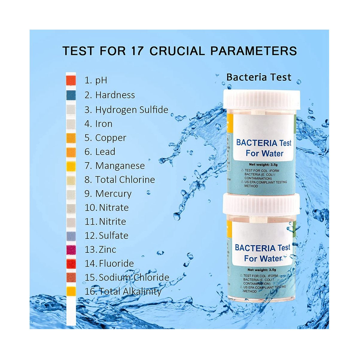 17-IN-1 Water Test Strips: The water test kit contains 17 parameter, such as pH,Hardness, Hydrogen Sulfide,Iron,Copper,Lead,Manganese,Total Chlorine,Free Chlorine,Nitrate,Nitrite Sulfate,Zinc,Fluoride,Sodium Chloride,Total Alkalinity & testing
