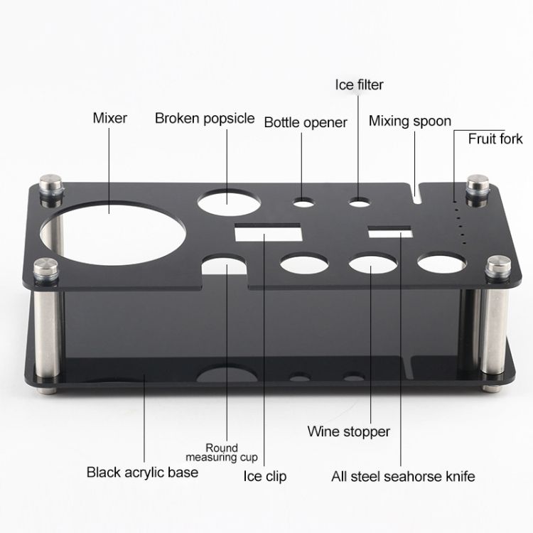 2. The kit includes tools: measuring cup, hippocampus, cocktail shaker, crushed popsicle, ice filter, wine stopper, black acrylic base, ice clip, bottle opener, spoon, fruit fork