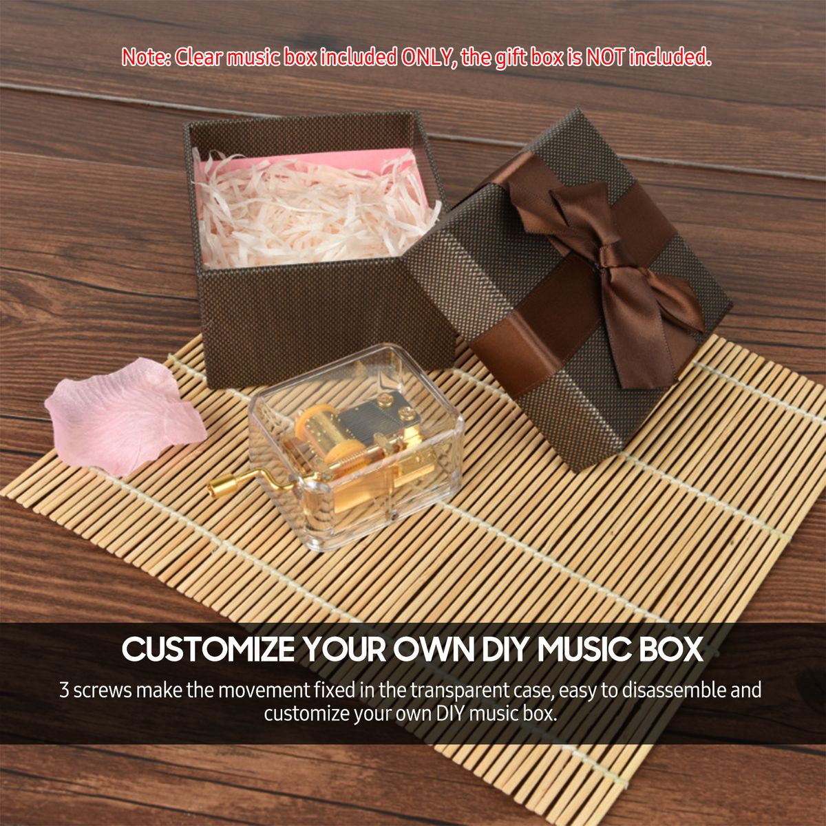 3 screws make the movement fixed in the transparent case, easy to disassemble and customize your own DIY music box.
