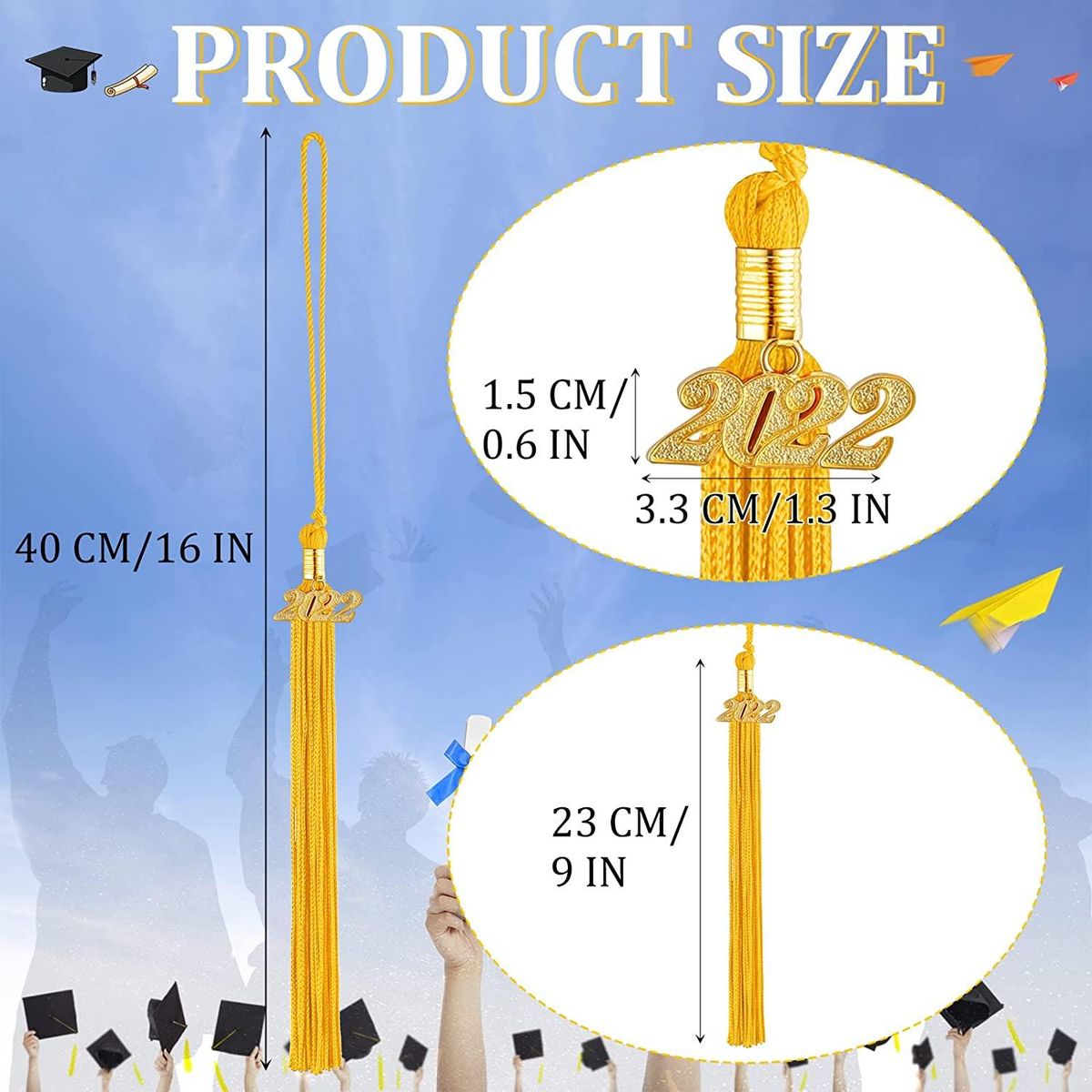 Dimension: the tassel length is about 23 cm/ 9 inches, the hang cord length is approx. 17 cm/ 6.7 inches, the weight is approx. 15 g, perfect for graduation hat, proper size and light in weight, convenient for you to decorate, won't produce much burden to you