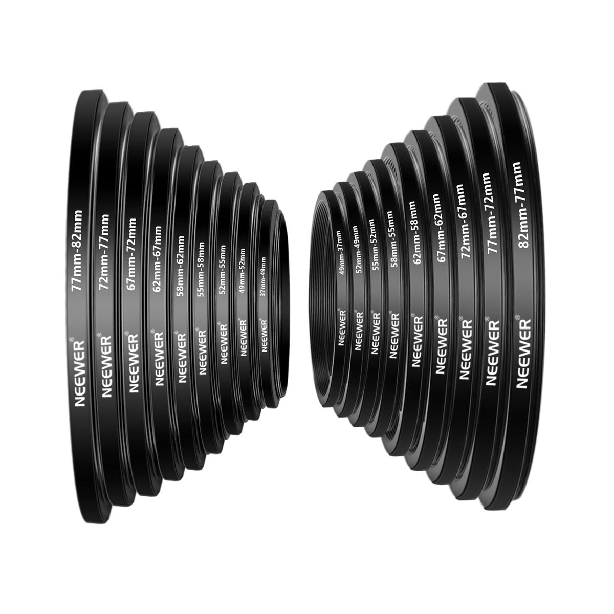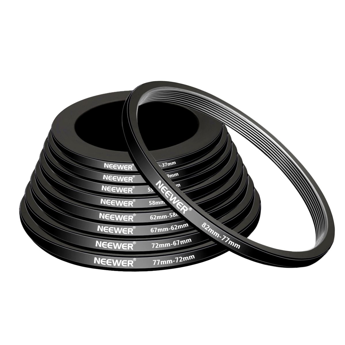 STEP-UP RING FILTER ADAPTER SET: 37-49, 49-52, 52-55, 55-58, 58-62, 62-67,67-72, 72-77, 77-82mm