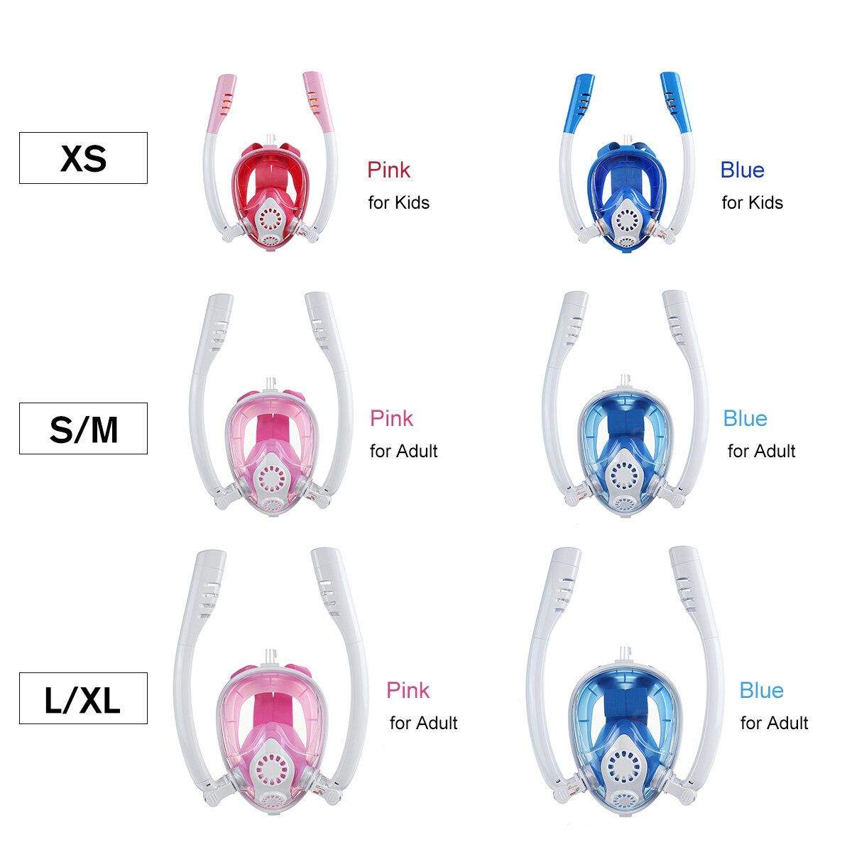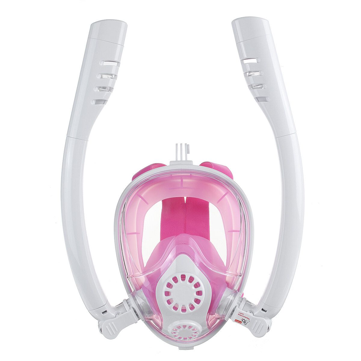 Features:* 180° WONDERFUL SEA VIEW: You will see more beautiful scenery than ever before. The well-designed and improved mirror gives you the best distortion-free visibility and maximum visibility.* GREATER SAFETY RESPIRATORY SYSTEM: The unidirectional (outer) circulation system has dual breathing features, this allows carbon dioxide to be mechanically isolated from the oxygen. The system is designed to allow free flowing oxygen to be inhaled via the 2 intake tubes which is separate from the exhaling chambers. This system prevents carbon dioxide from remaining in and entering the body to cause life threatening and accidents.* ANTI-FOGGING: Allow you to explore the underwater world in clarity.* LEAKAGE-PROOF: Our snorkeling uses non-toxic silicone which provides a tight waterproof sealing area. It has ergonomics of waterproof safety mechanism, smooth drainage and wear safety, in order to escort your snorkeling experience.* HIGH QUALITY: Made of premium PC and Food Grade Silicone, Non-toxic and environmentally friendly.