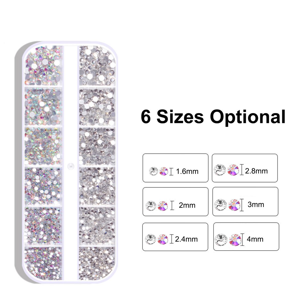 1800 Pcs nail decors are included, 1.6mm, 2mm, 2.4mm, 2.8mm, 3mm, 4mm, you can do lots of different designs with them.