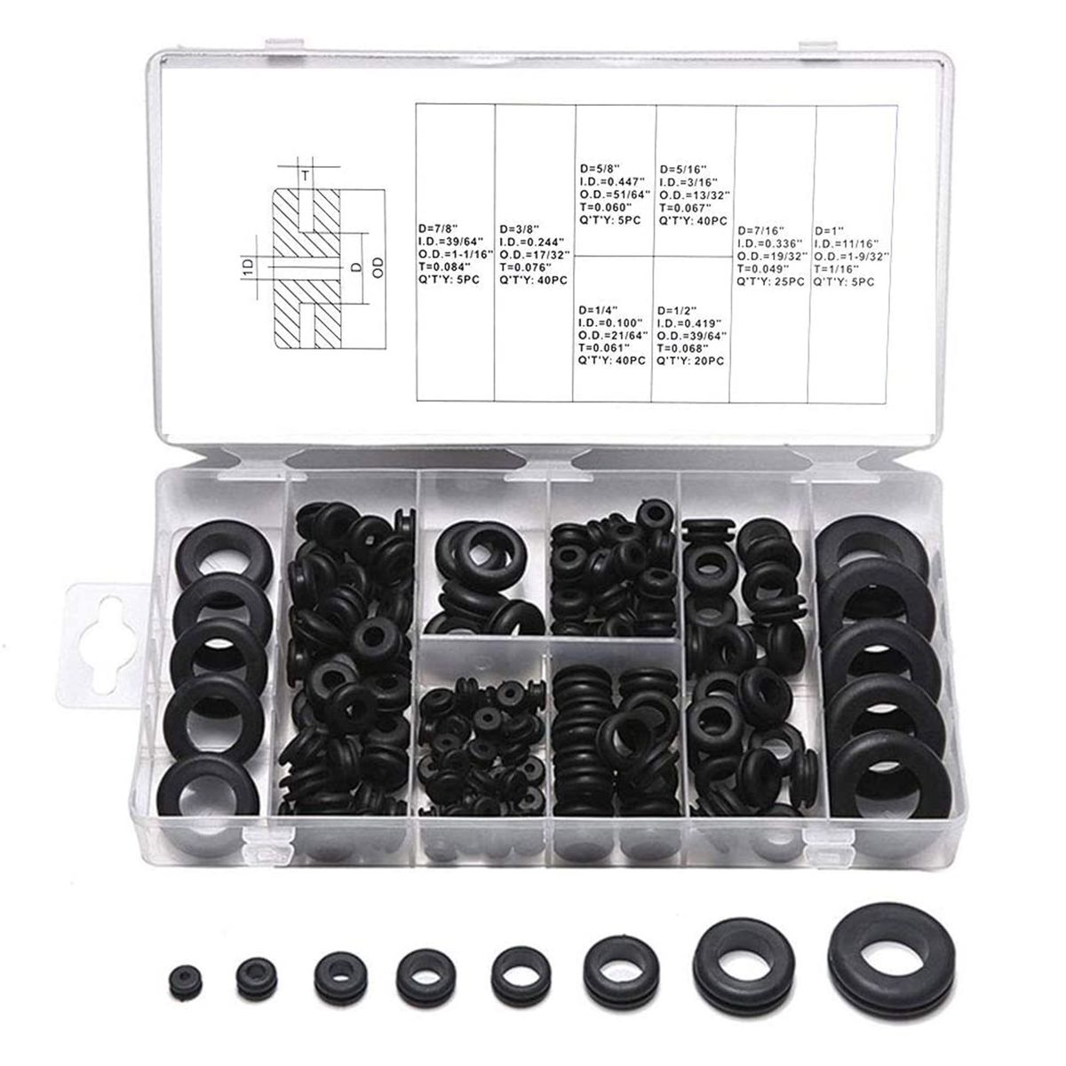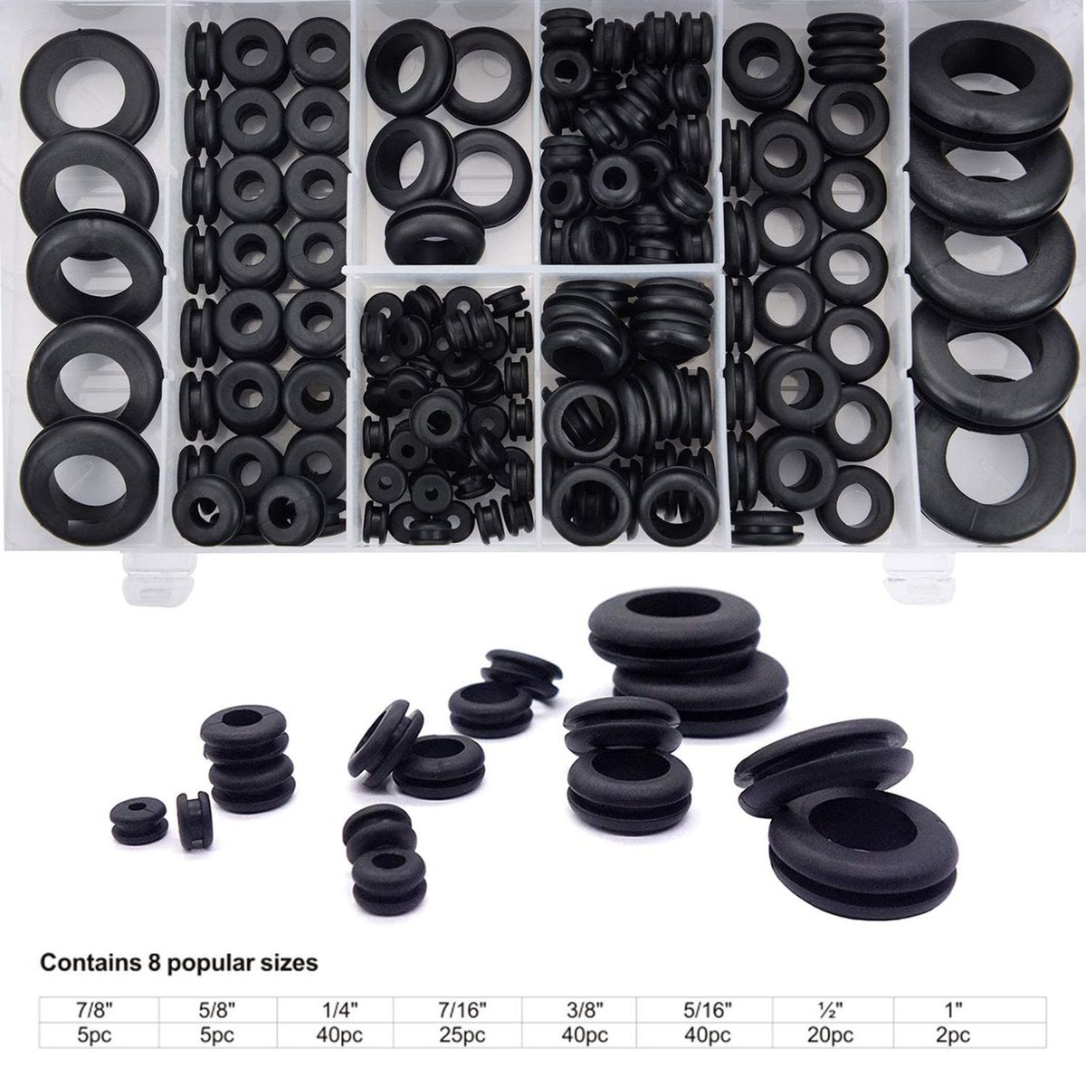 180pcs rubber grommet in 8 common sizes.