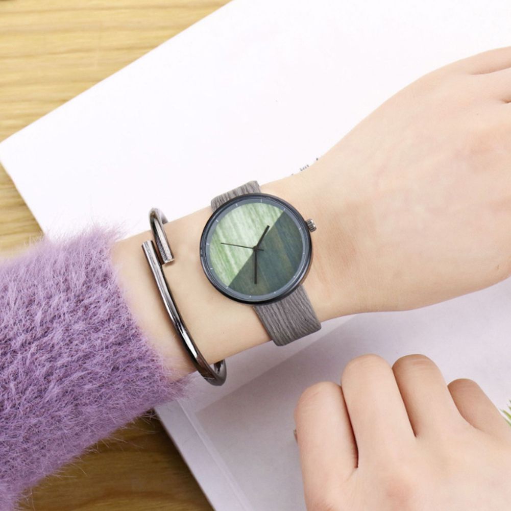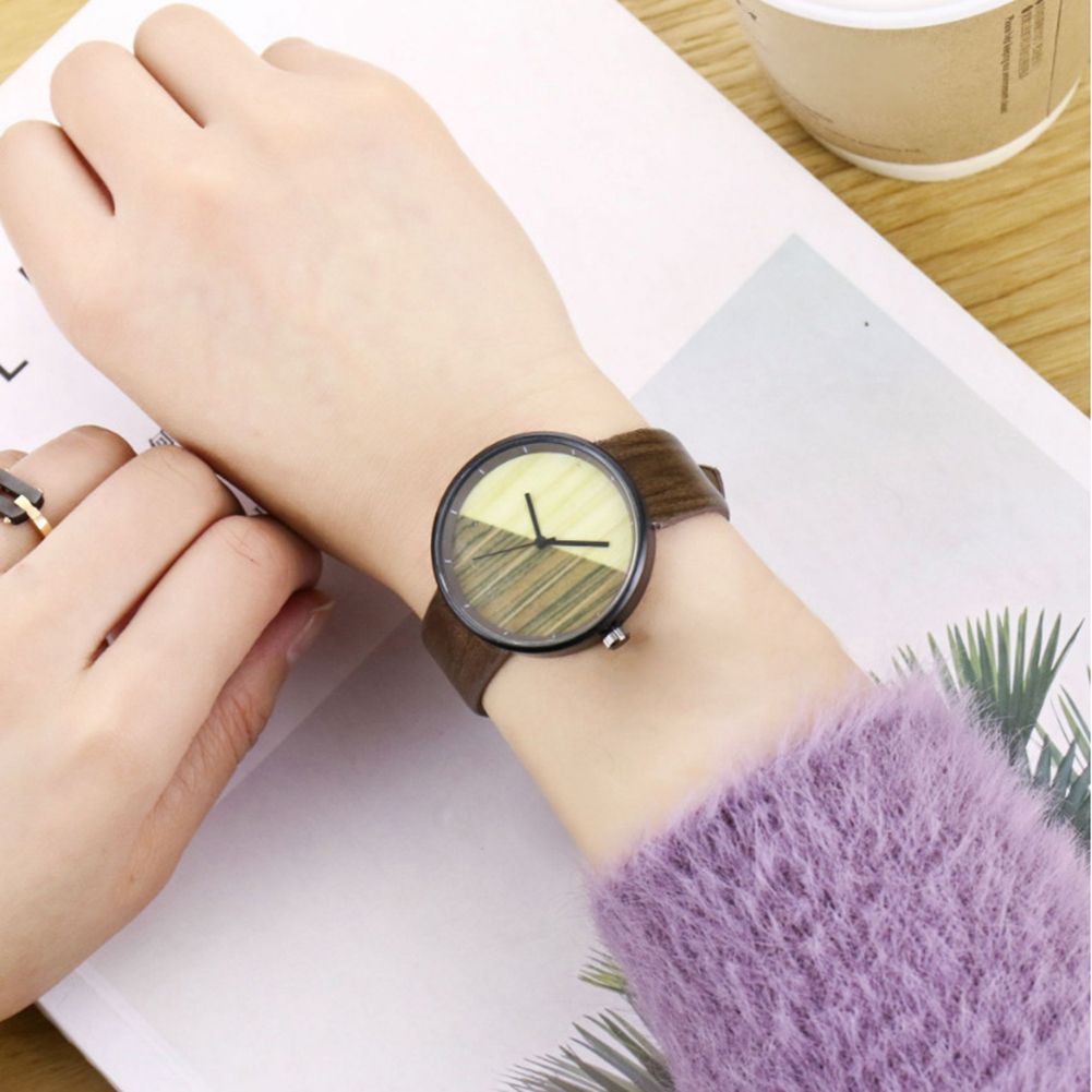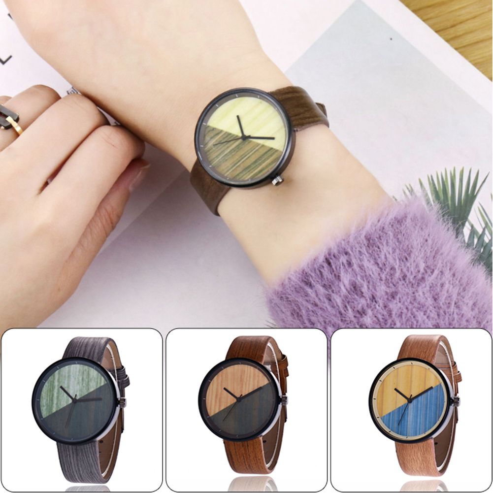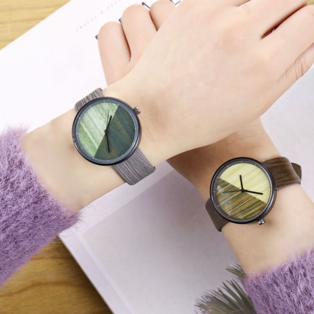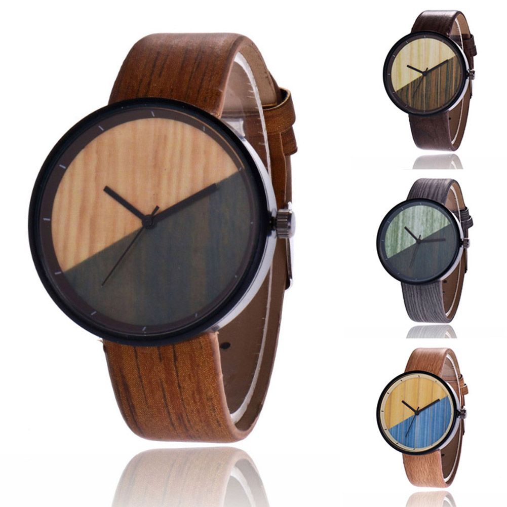 Features: Vintage, Faux Leather Strap, Wood Grain, Round, Couple's Gift