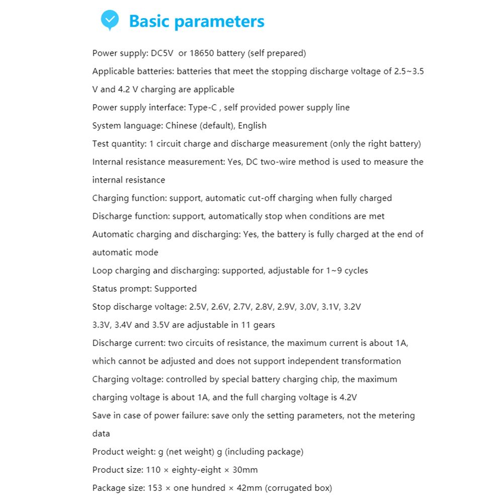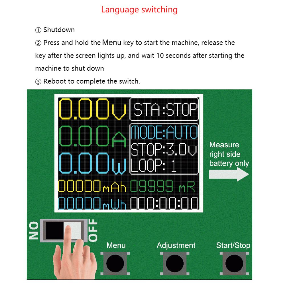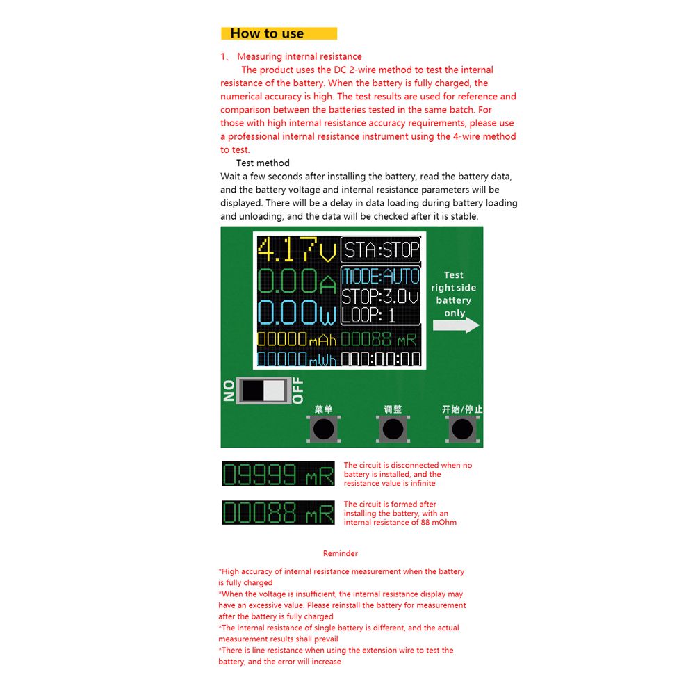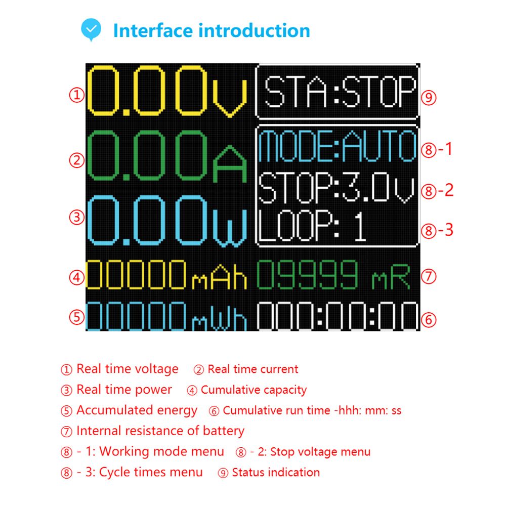 Digital Display: 1.77inch digital display, clearly display the real time voltage, real time current, real time , accumulated capacity, accumulated energy, status indication, operating mode, stop discharge voltage, number of cycles, battery internal resistance and accumulated time.