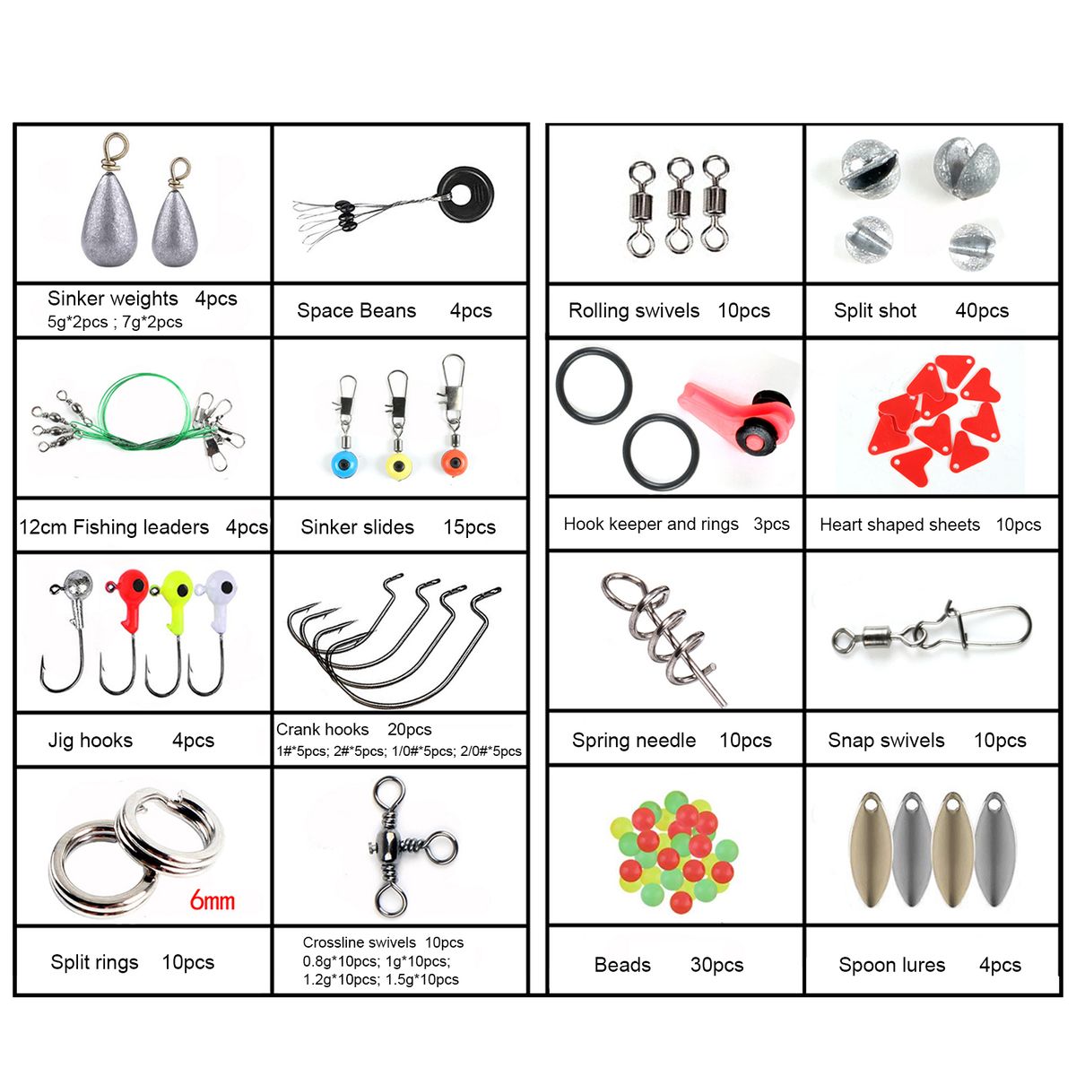 188pcs fishing accessories include fishing swivels, sinkers, leaders, and various necessary accessories.