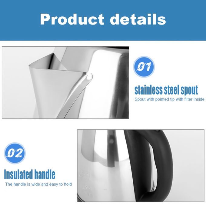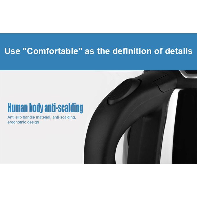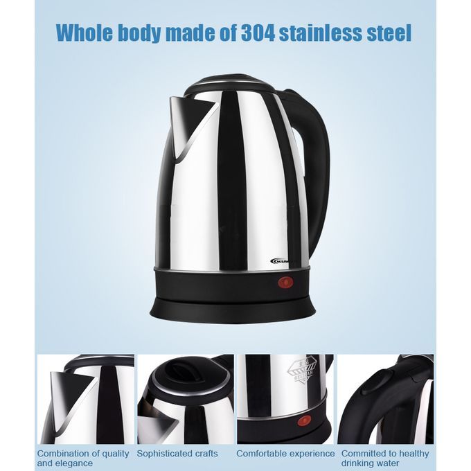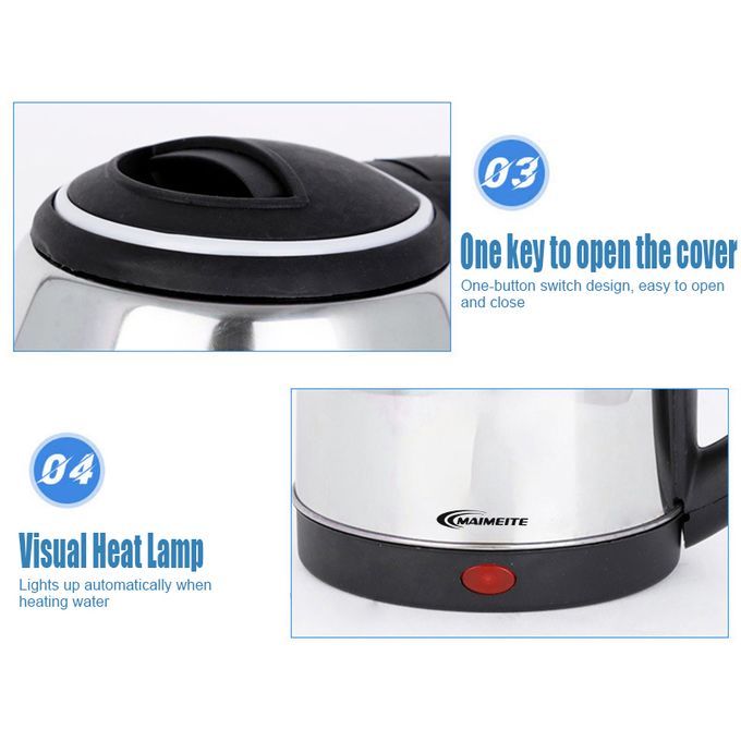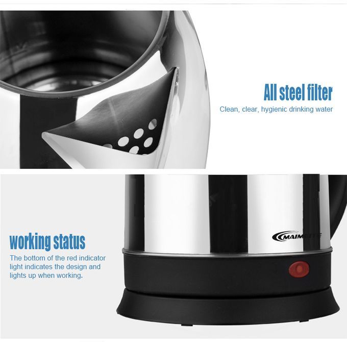 Maimeite Electric Kettle is stylish, easy to use and durable.Made of stainless steel, the Maimeite Electric Kettle is sturdy and features a flat heating element that boils water quickly and is easy to clean.This electric kettle with 1.8L capacity is stylish yet simple. perfect for every kitchen with its stainless steel body, you can be sure to have access to boiled water every time Grab this deal and more at unbeatable price. Highlight element water level indicator and filter Automatic switch off Boil dry protection Overheating protection Body.Two metal controllers, double safety protection for dry burning.A steam switch that automatically shuts off after the water is boiled.