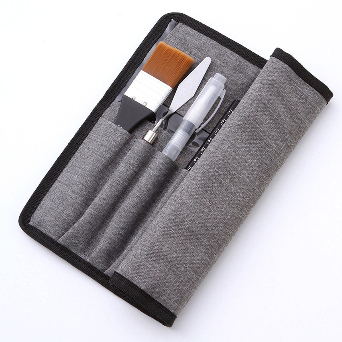 18pcs paint brush kit comes with 12 types of paint brushes, 1 scraper, 1 yellow sponge ball, 1 2B pencil, 1 Watercolor brush pen, and a canvas storage bag.