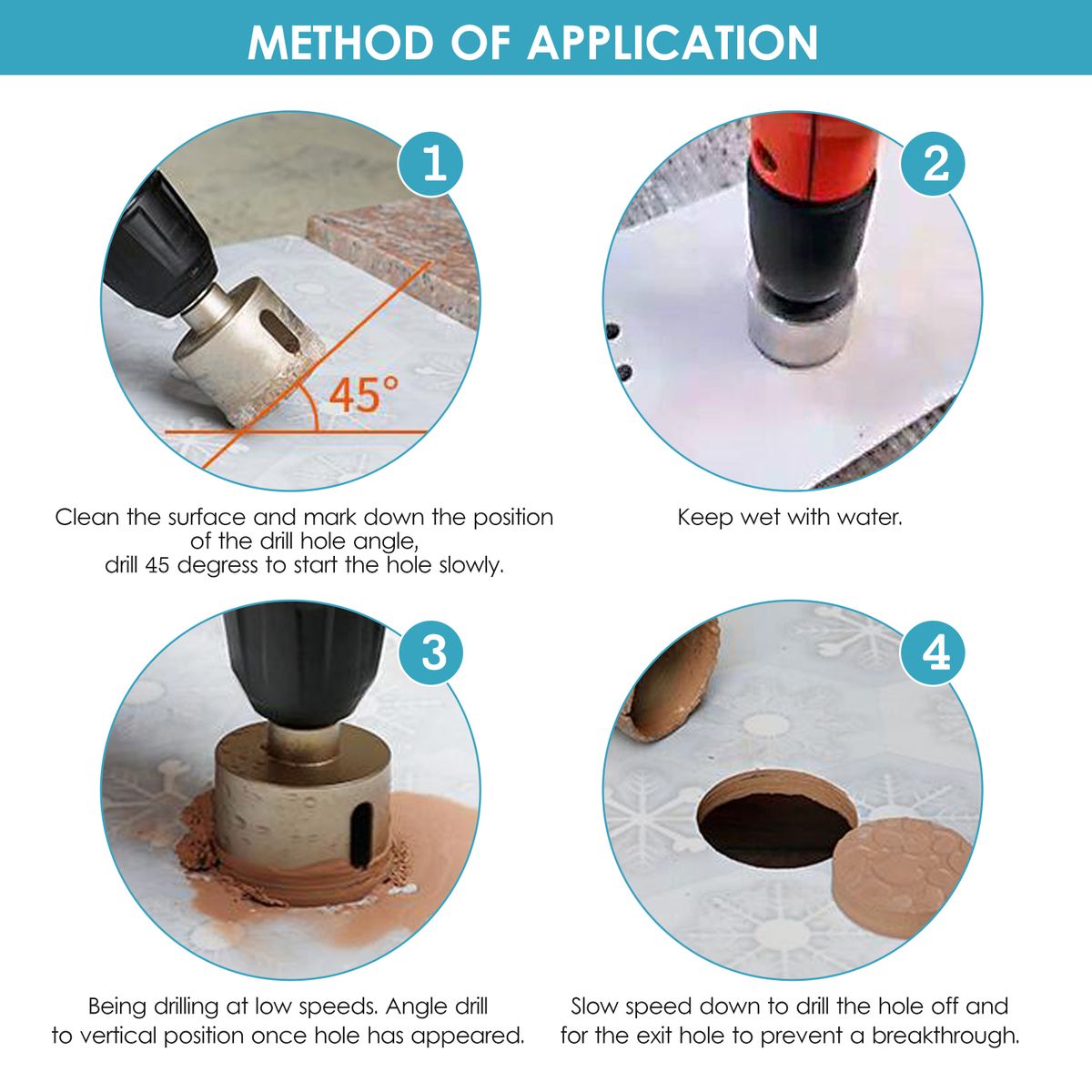 【Warm Prompt】When the diamond bit is working, please continue to add water to reduce the drilling speed, reduce the drilling pressure, and increase the water lubricity, which will greatly extend the life of the bit. Being hollow, allows the water to flow up inside and around the inner core of these drill bits as you are drilling, helping to keep the drill bit cool and removing the debris. Start your hole diagonally, make a round trace and then hold drill straight.