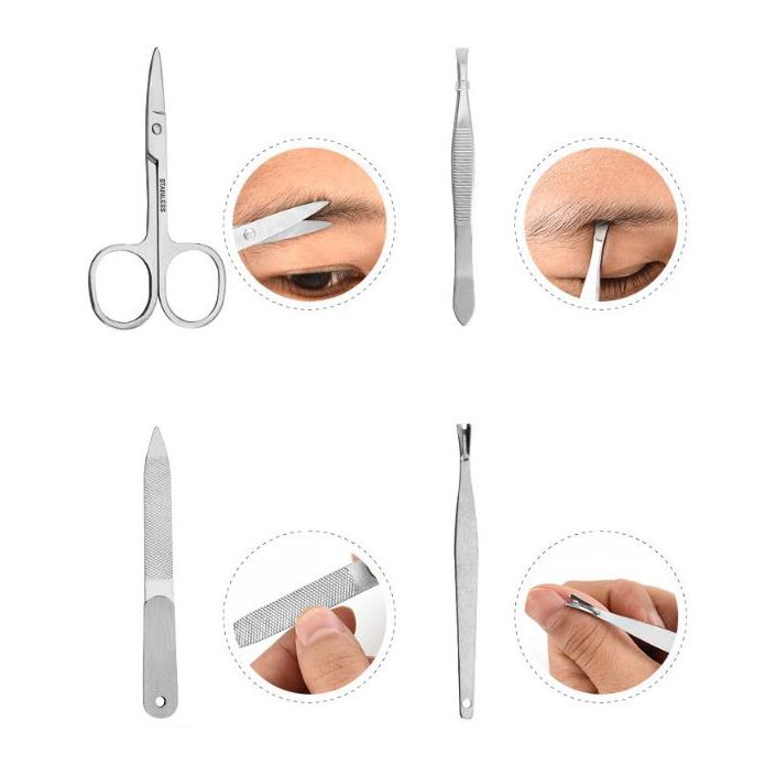 Package includes: 1 set (18 pieces)Material: stainless steelPackage box material: woven fabric Makes life more beautiful and more convenient - Contains of: nail clipper, diagonal nail clipper, eyebrow scissor, nail file, eyebrowFlexible, lightweight and portableHigh quality and compact designElegant woven fabric case