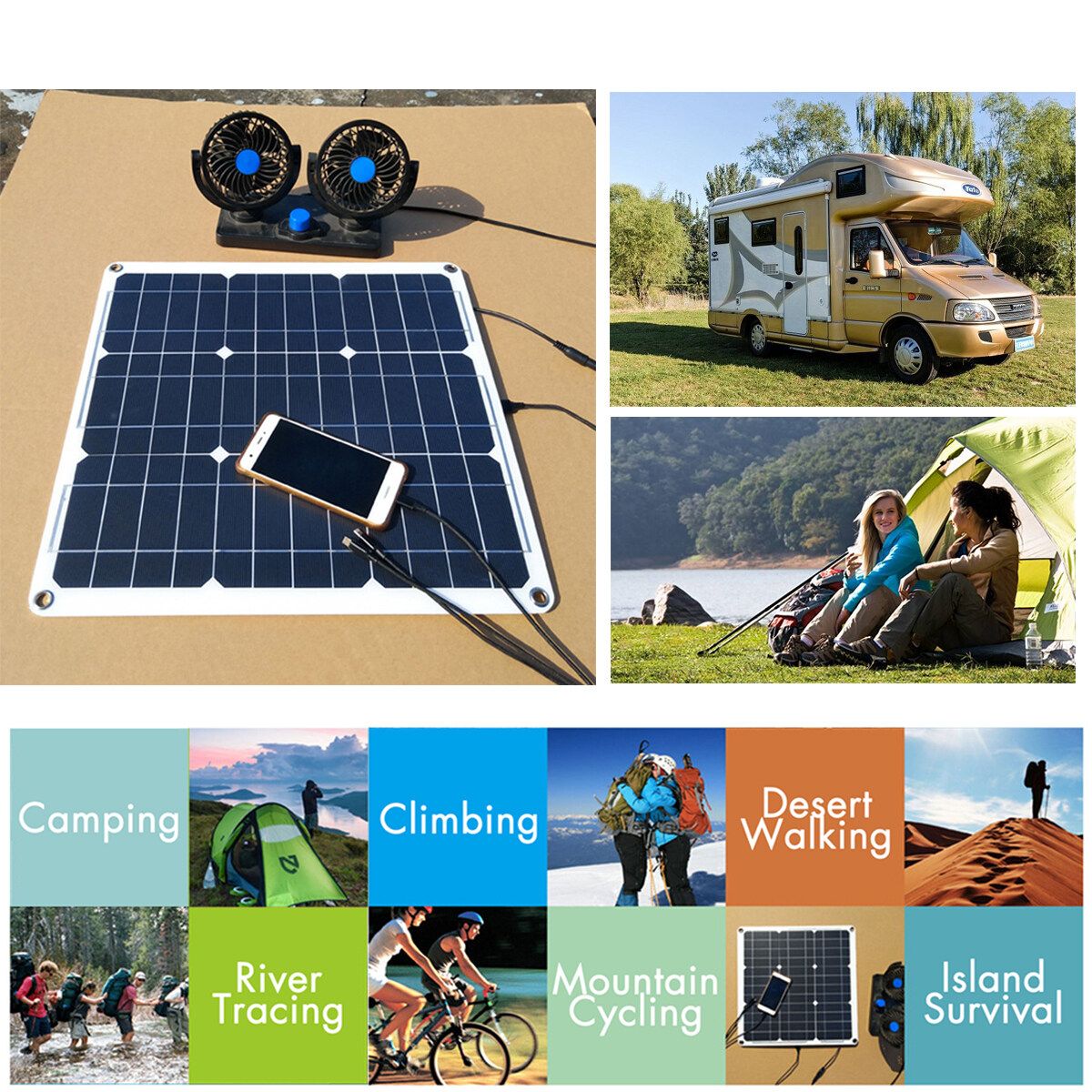 50W 18V Mono Solar Panel Dual USB 12V/5V Monocrystalline Flexible Solar Charger For Car RV Boat ChargerFeatures:1.Equipped with 12V DC5.5x2.1 5V USB output interface.2.Dedicated for 12V and 5V device charging.3.EVA+PET at front panel, flexible, light-weight but durable.4.Mono-crystalline solar Cell with efficient up to 21%.5.4x eyelet and free 2x carabiners for mounting more conveniently.6.IP65 waterproof, suitable for outdoor using in light rain.7.Well package with sponge mat and corner protectors.