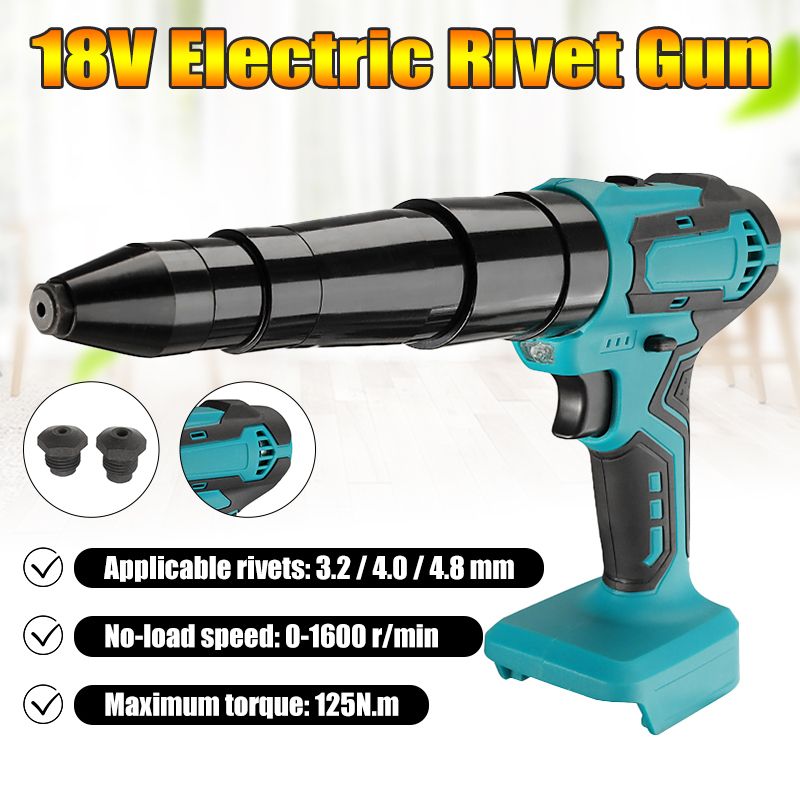 Suitable for Makita batteries ( Not included ) Specification: Name: Rivet Gun Maximum torque: 125N.m No-load speed: 0-1600 r/min Applicable rivets: 3.2 / 4.0 / 4.8 mm The package includes: 1x Rivet Gun ( Without battery) Note : The diameter of rivets is 3.2mm, 4.0mm, suitable for aluminum, and stainle steel; The rivet diameter of 4.8mm is only suitable for aluminum and rivets.