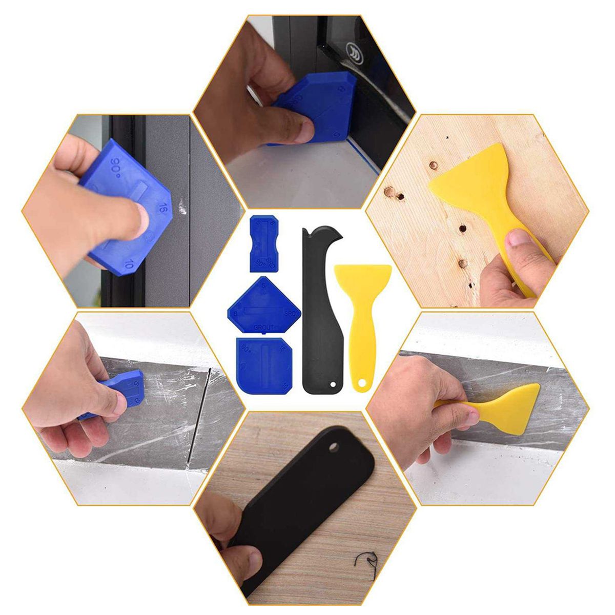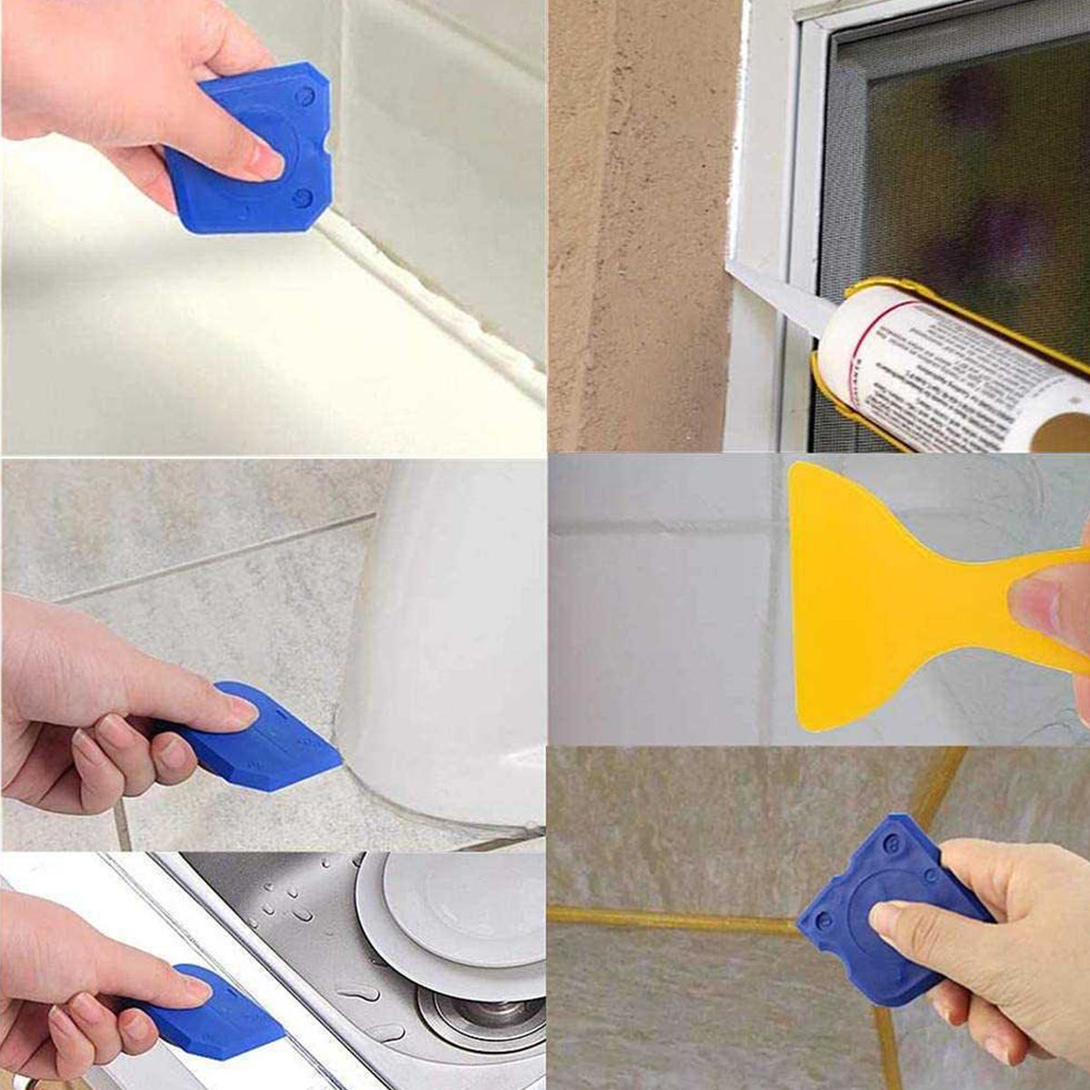 Kit: Composed of 1 sealant silicone removal,7 blue silicone sealant finishing tools,1 white caulk nozzle,1 yellow grout scraper, 2 red caulk nozzle caps,6 replaceable pads for 3 in 1sealant silicone removal, and 1 black caulk remover.