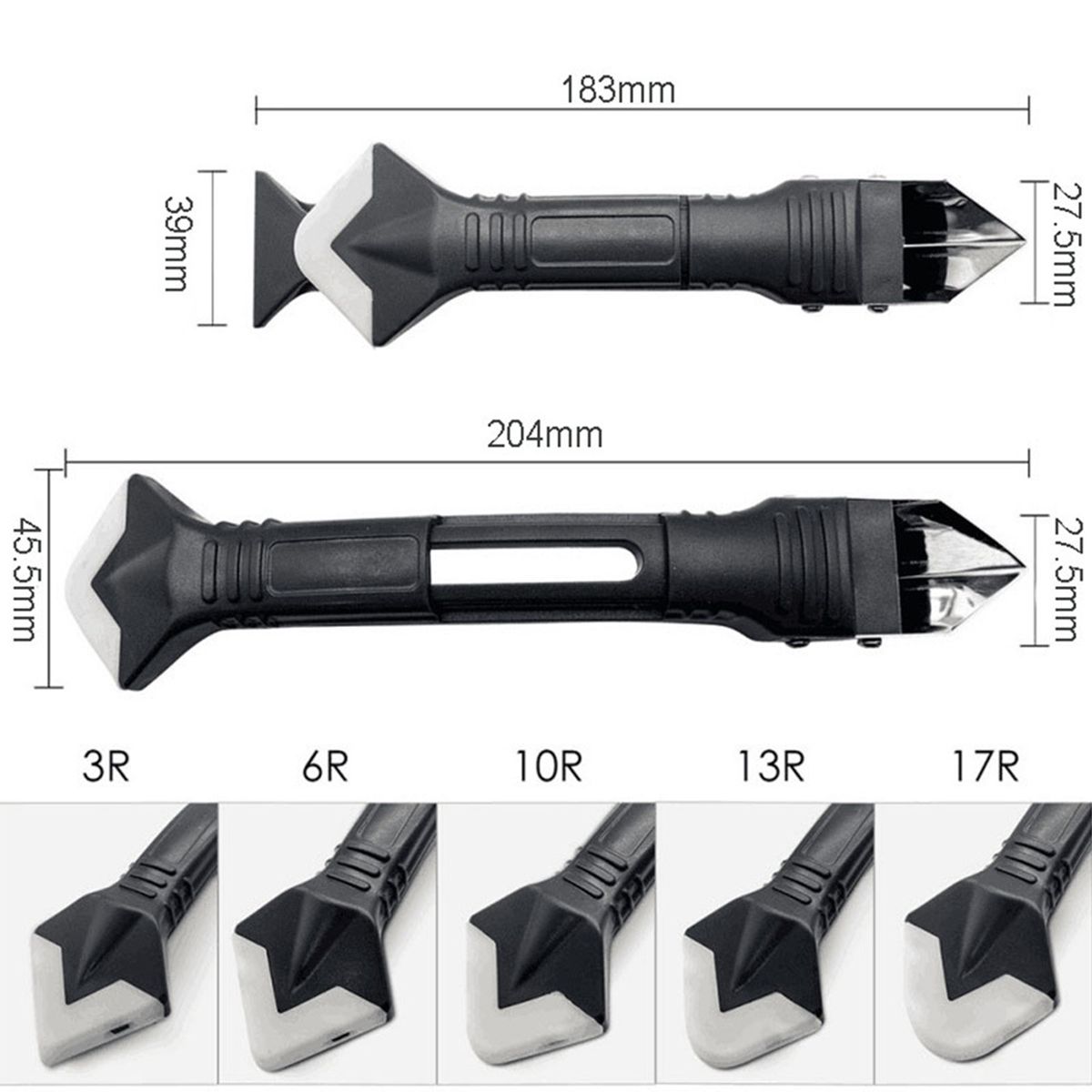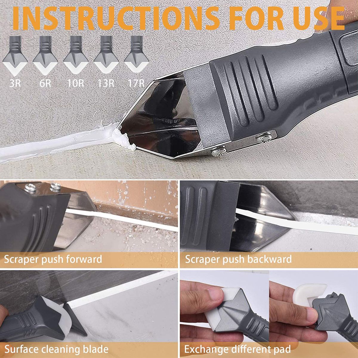 Usage: This set of tools can help you repair the gap and clean the residual glue, which is convenient and beautiful. The upgraded stainless steel scraper removes stubborn old glue easily; the grout scraper can remove surface bumps and dents. The 3in 1 is designed with the non-slip push-all button. You can choose the appropriate silicone pad as you like( 3R,6R,10R,13R,17R).