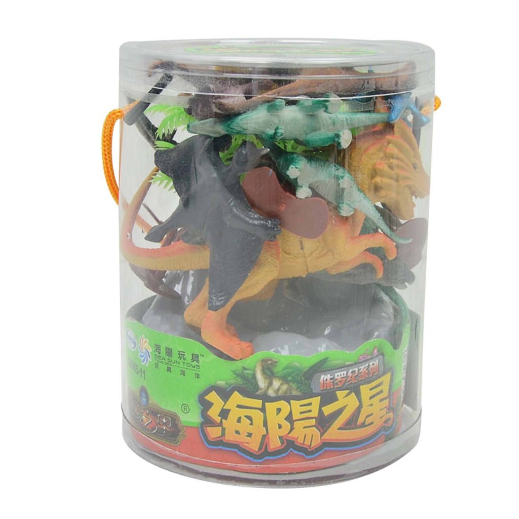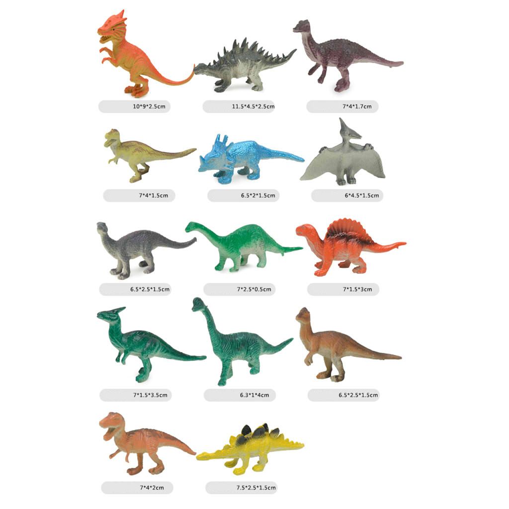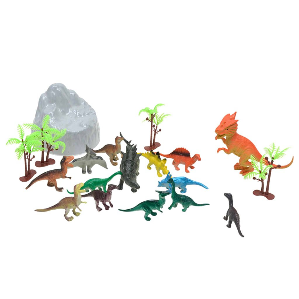 A Set of 19 Pieces Dinosaur Toys. Includes 14 Pieces Dinosaur, 1 Piece Rockery and 4 Pieces Tree Models