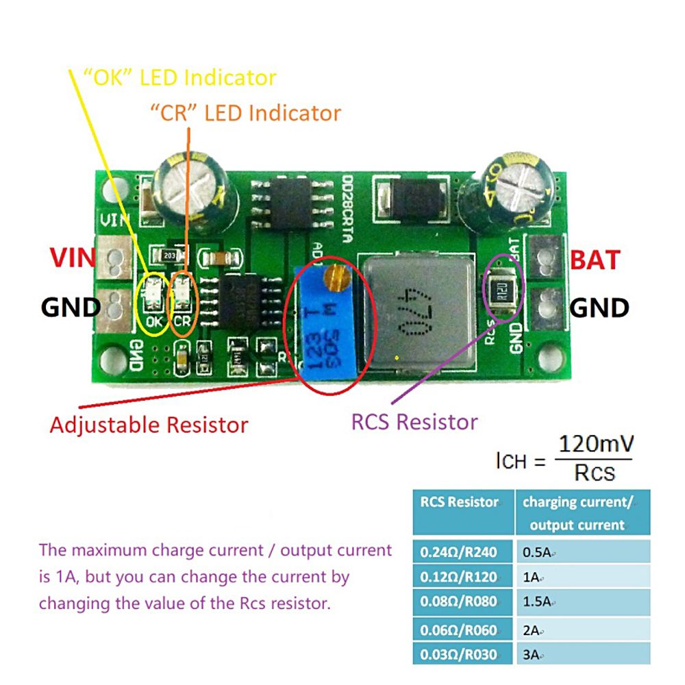 The maximum charge current/output current is 1A, but you can change the current by changing the value of the Rcs resistor.