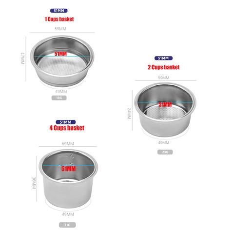 Product DiscreptionProduct name: coffee powder bowl, coffee basketMaterial: Stainless steelVarious specifications: 51MM1Cups basket/2 Cups basket/4 Cups basketSize: Reference pictureFeatures:1. High quality 304 stainless steel, health and safety. 2. Three layers filter mesh is fine pressed, the coffee is fine and fragrant. 3. Thickened cup body, durable.
