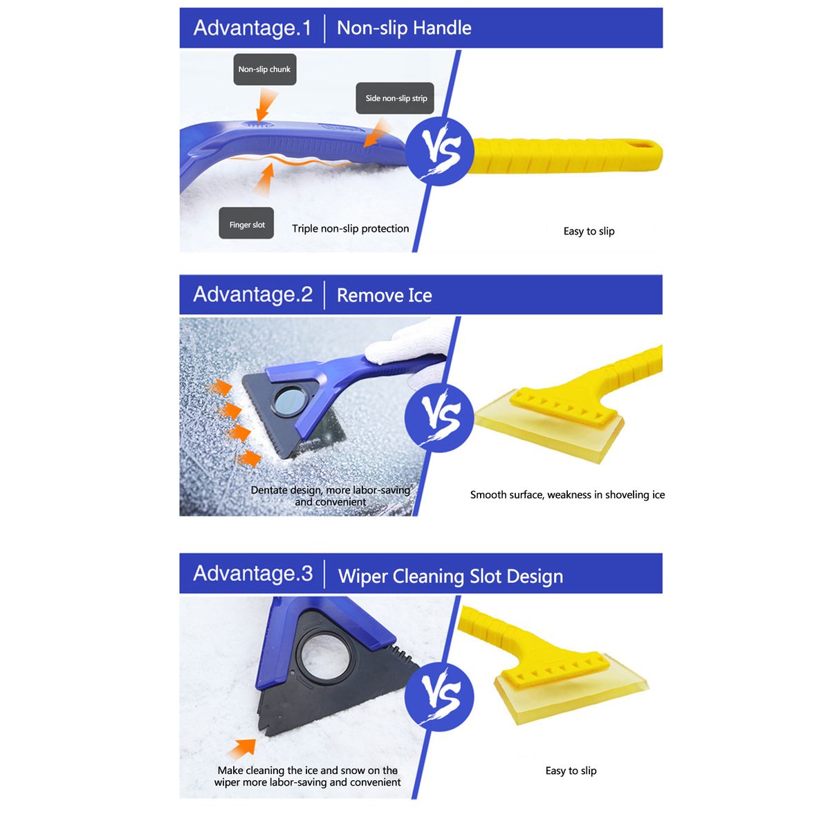 Three different sides for differnt uses, round-angle blade to shovel snow does not damage window glass, dentate design to remove ice is labor-saving and convenient, fine blade to scrape frost not damage car paint.