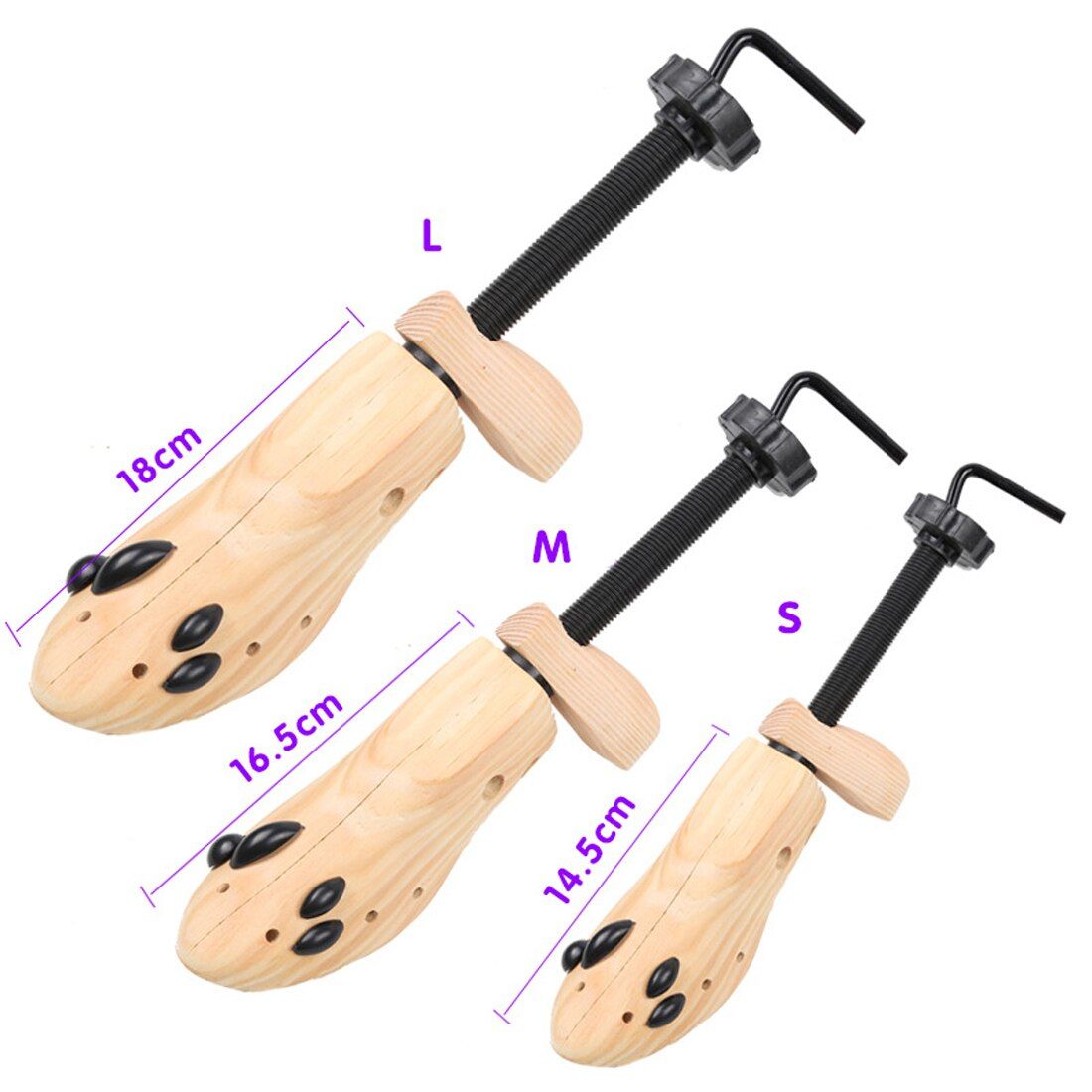 Wooden 2-Way Shoe Stretcher For Man And Woman For women: S: 35-38(EU size), 5~6(US size), 4~5(UK size) M: 39-41(EU size), 6~7.5(US size), 5~6.5(UK size) For men: L: 42-46(EU size), 7.5~9.5(US size), 6.5~8.5(UK size) Note:only have one not a pair. so if you need a pair please buy 2 piece item can be use for right and left shoes ,Don't distinguish between left and right High quality wooden shoe stretcher Made with 100% real wood and four pieces preure relief plugs Stretch your new shoes, reducing the painful break-in period Handy device enables you to stretch any pair of shoes to accommodate the exact size of your feet Fit both left and right shoe Stretches both length and width easily Product Material: Wood Package Included 1pcs x Wooden Shoe Stretcher ADJUSTABLE SHOE STRETCHER INSTRUCTION This shoe stretcher enables you to stretch both the length and width of a shoe. It is suitable for left or right shoe. At first, insert the removable preure relief plugs in the appropriate holes where relief is needed. Then insert stretcher in shoe. FOR STRETCHING LENGTH: Turn the round plastic handle in clockwise direction until you begin to see surface preure showing on shoe. DO NOT OVERSTRETCH! FOR STRETCHING WIDTH: Turn the metal crank handle in clockwise direction until you begin to see surface preure showing on shoe. DO NOT OVERSTRETCH! FOR BEST RESULTS: Leave shoe stretcher in place for at least 24 hours. TO REMOVE STRETCHER FROM SHOE: Turn handles in counterclockwise direction.