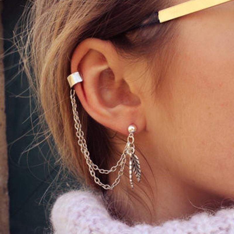 Features: Long Chain Tassels, Butterfly Leaf Cross Drop, Cuff Clip Earrings
