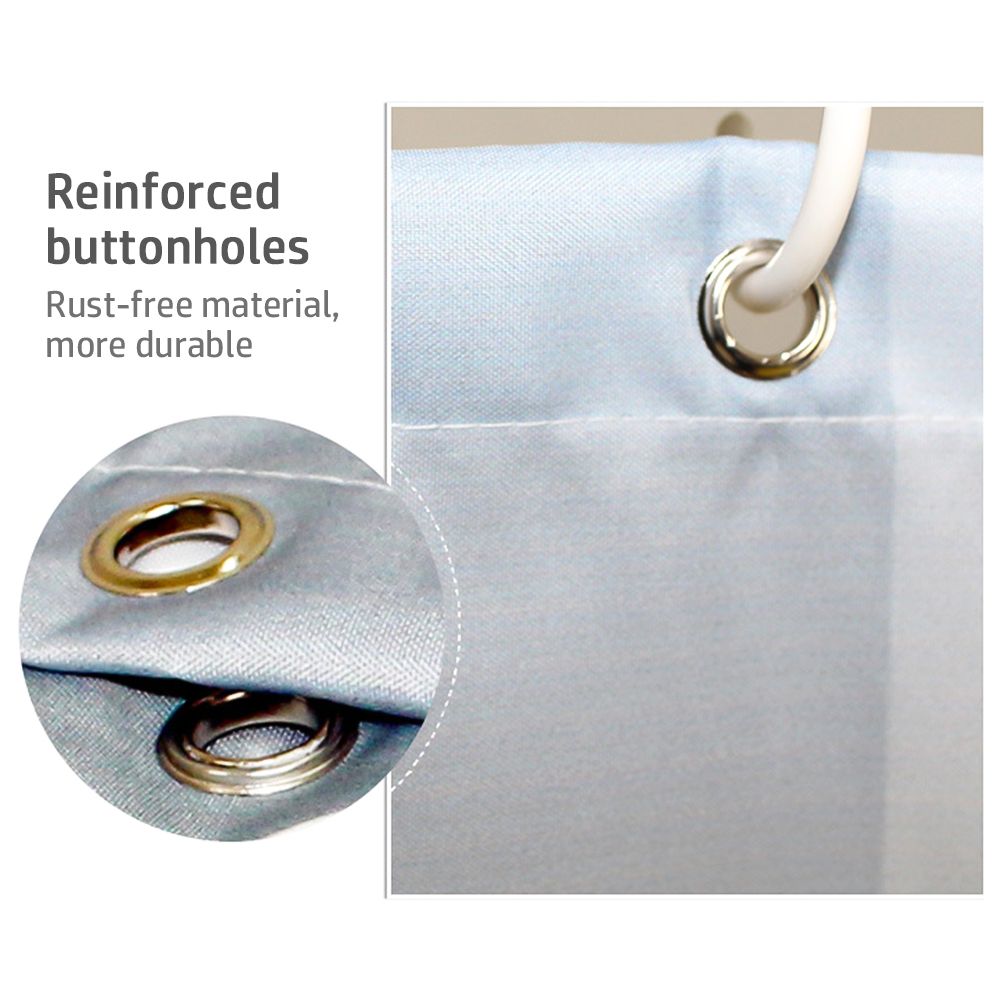 3. This shower curtain is equipped with enhanced buttonhole, which is made of high quality material without rust and is more durable.