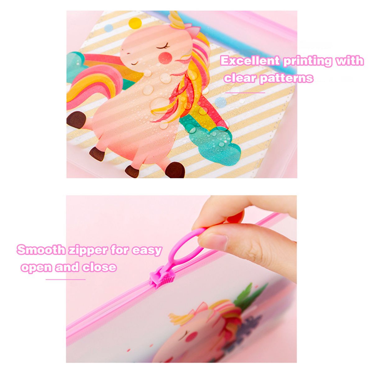 Description:Our zipper bag is a nice choice for School Office Supplies/Travel Storage/Makeup Organizer. Four unicorn-patterns are optional. Exquisite printing and cute patterns add an aesthetic feeling to your desk. Translucent design allows you to quickly find out the items. Premium PVC ensures water-resistant use. The pull-ring design allows for easy suspending and carrying.