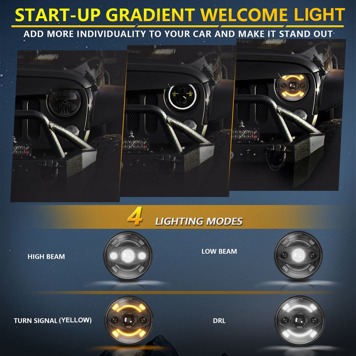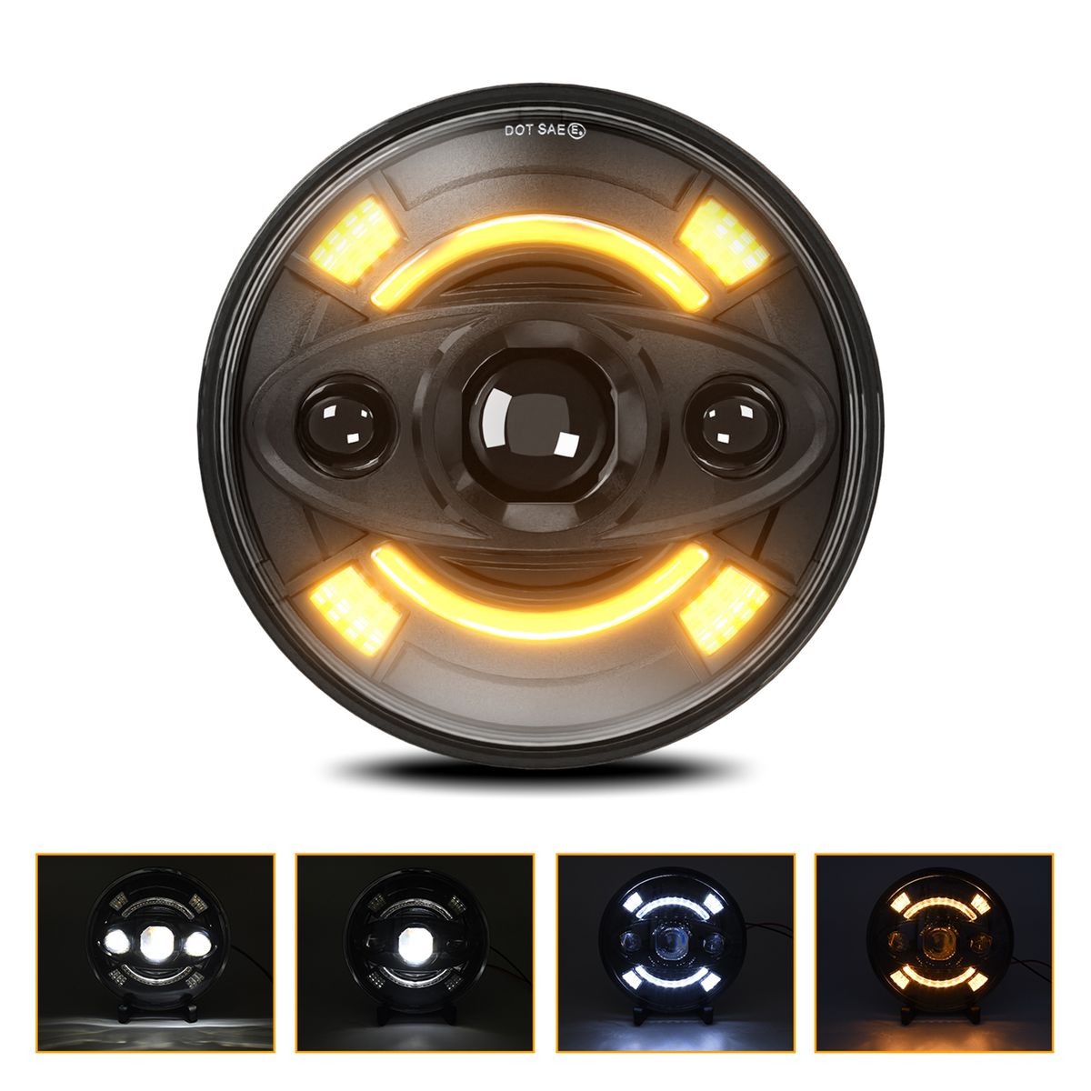 4 Lighting Modes: The 6000K/3000K round headlight has 4 lighting modes: high beam (white), low beam (white), daytime running light (white), and turn signal (yellow), perfectly replacing the halogen lamp, providing a variety of modification needs.