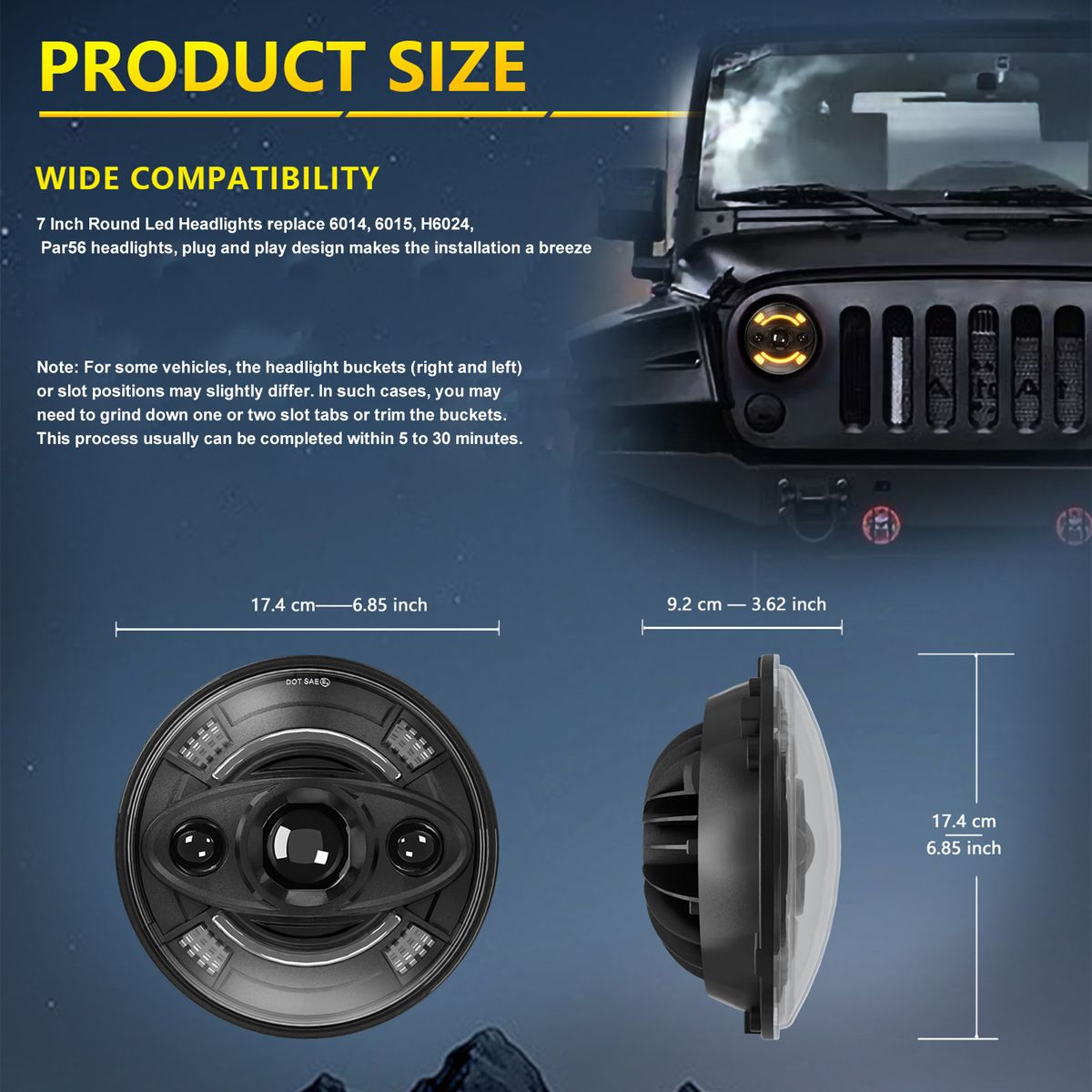 Wide Compatibility: Not only suitable for replacement for Jeep Wranglers, but also compatible with various motorcycles with 7-inch round lights, as well as vintage cars. Please confirm the size before purchasing.
