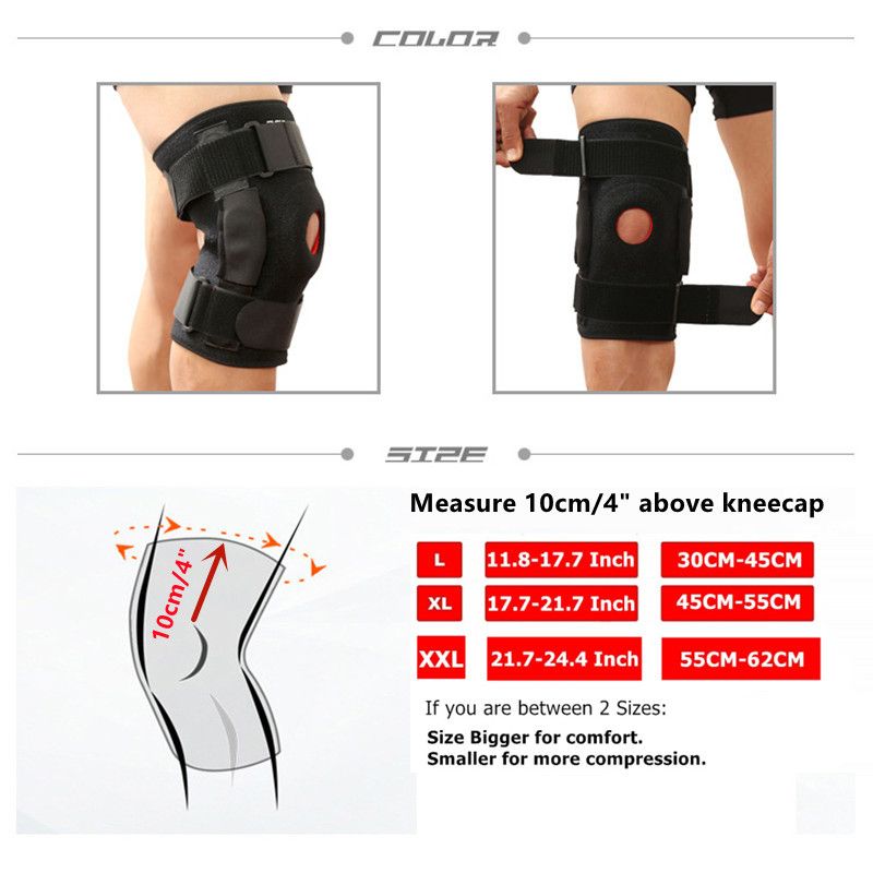 1PCS Men Women Knee Support Brace Adjustable Open Patella Knee Pad Protector Guard for Gym Workout Sports Arthritis Joint PainSize: Measure the thigh circumference 10cm/4 from the top of you kneecap.L: Fits thigh circumference 30-45cm/11.8-17.7 inch;XL: Fits thigh circumference 45-55cm/17.7-21.7 inch.XXL: Fits thigh circumference 55-62cm/21.7-24.4 inch.The product can be used for both Right and Left leg.Packing:1 PCS Knee Support(1 PCS ≠ 1 Pair)Features:▶ OPEN-PATELLA DESIGN - Ensures the knee cap remains in its proper position, and distributes stress across the knee discomfort.▶ DUAL HINGES STAYS - Relieves pressure and reduces stress on the knee during intense exercise and heavy usage.▶PREMIUM MATERIAL - Three dimensional knitting design to apply Graduate & Optimum Compression on Knee Joint without restraining your movement.▶ REMARKABLE SUPPORT - Perfect for Volleyball, Weightlifting, Skiing, Jogging, Walking, Hiking, Wrestling, Gymnastics, or other Activities.▶FULLY ADJUSTABLE - Universal size , fits the Left or Right knee Knee circumference.1PCS Men Women Knee Support Brace Adjustable Open Patella Knee Pad Protector Guard for Gym Workout Sports Arthritis Joint Pain