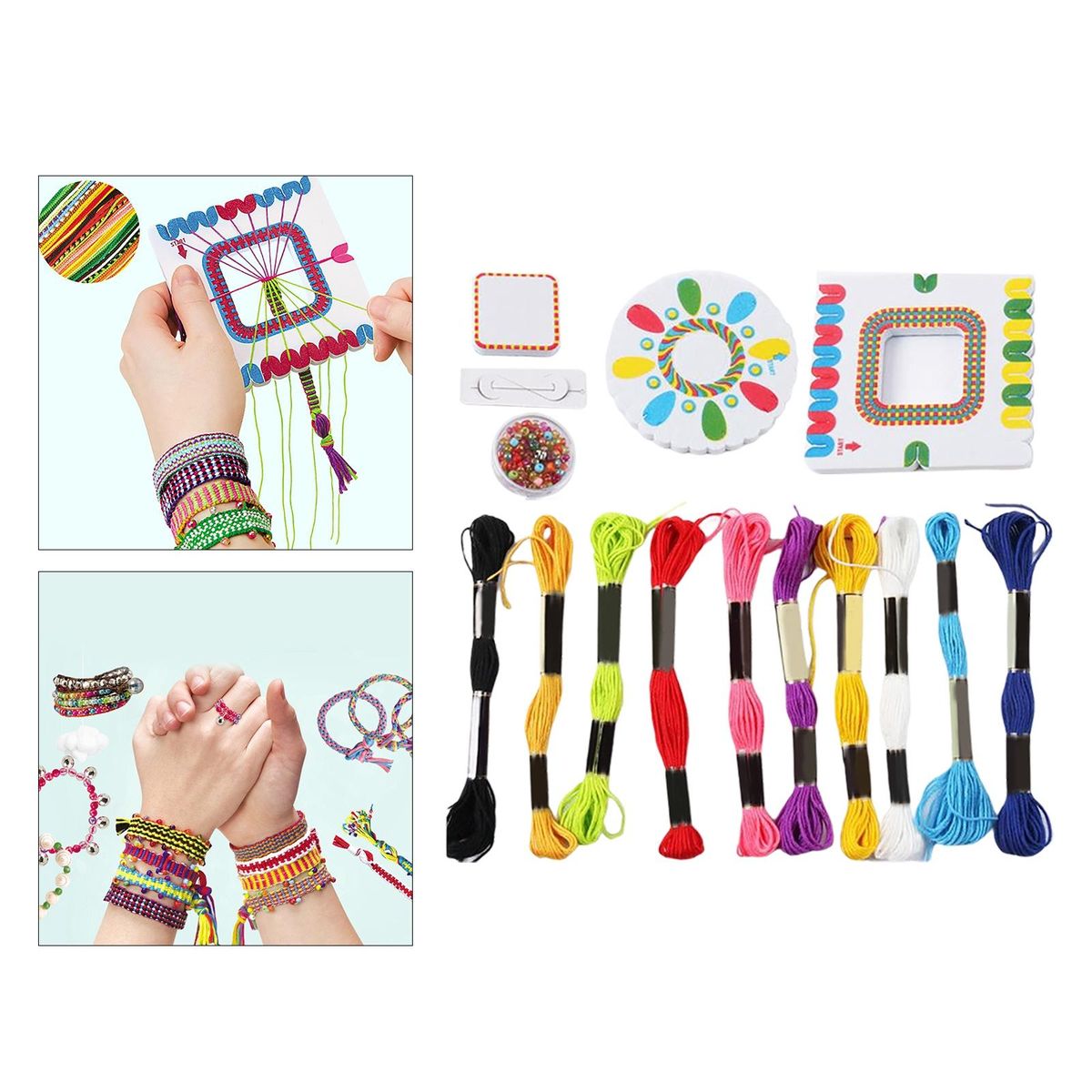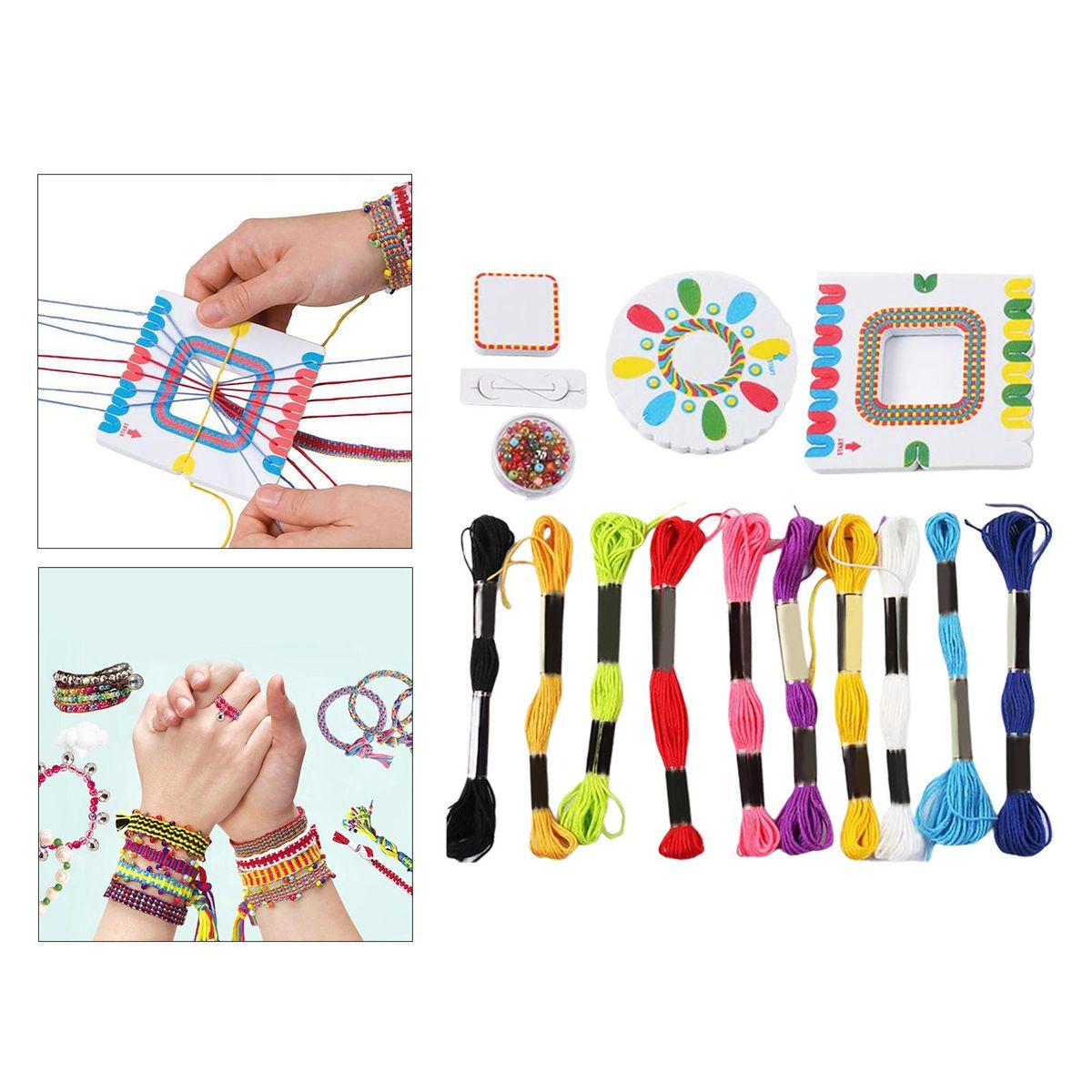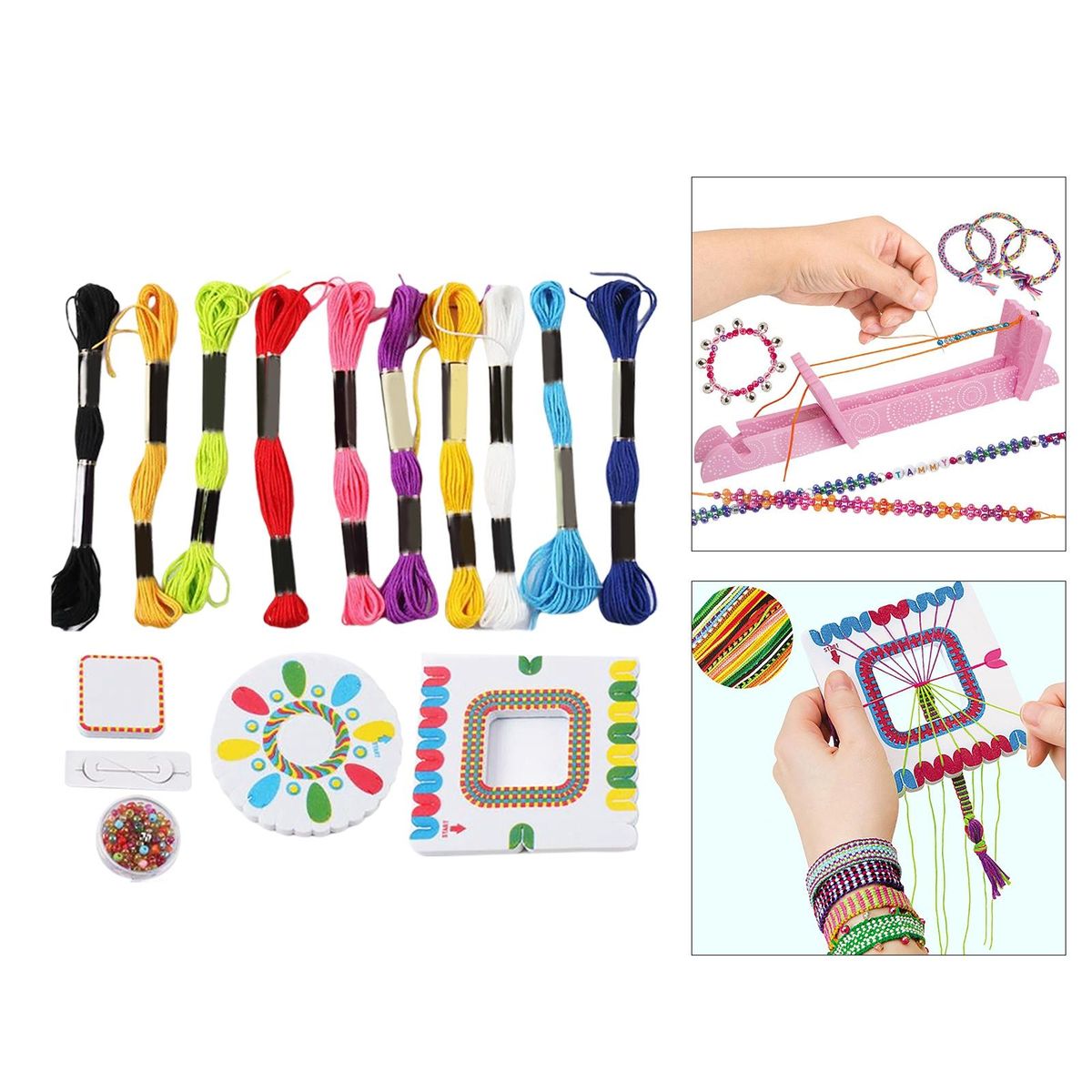 As You Choose 10 Piece round box colored beads, 1 Piece beading , 10Pieces colored cotton thread, 1 Piece round knitting board, 1 Piece square knitting board, 1 Piece instruction manual2 Piece Round box colored beads, 10 Pieces Colored cotton thread,2 Pieces Square woven board, 1Piece Special beading , 1Piece Instruction manual10 Pieces Round box colored beads, 2Pieces Crystal line, 1Piece Special beading , 1Piece Instruction manual10 Pieces Round box colored beads, 2Pieces Crystal line,1 Piece Special beading , 4 Piece Rubber band, 1 Piece Instruction manual