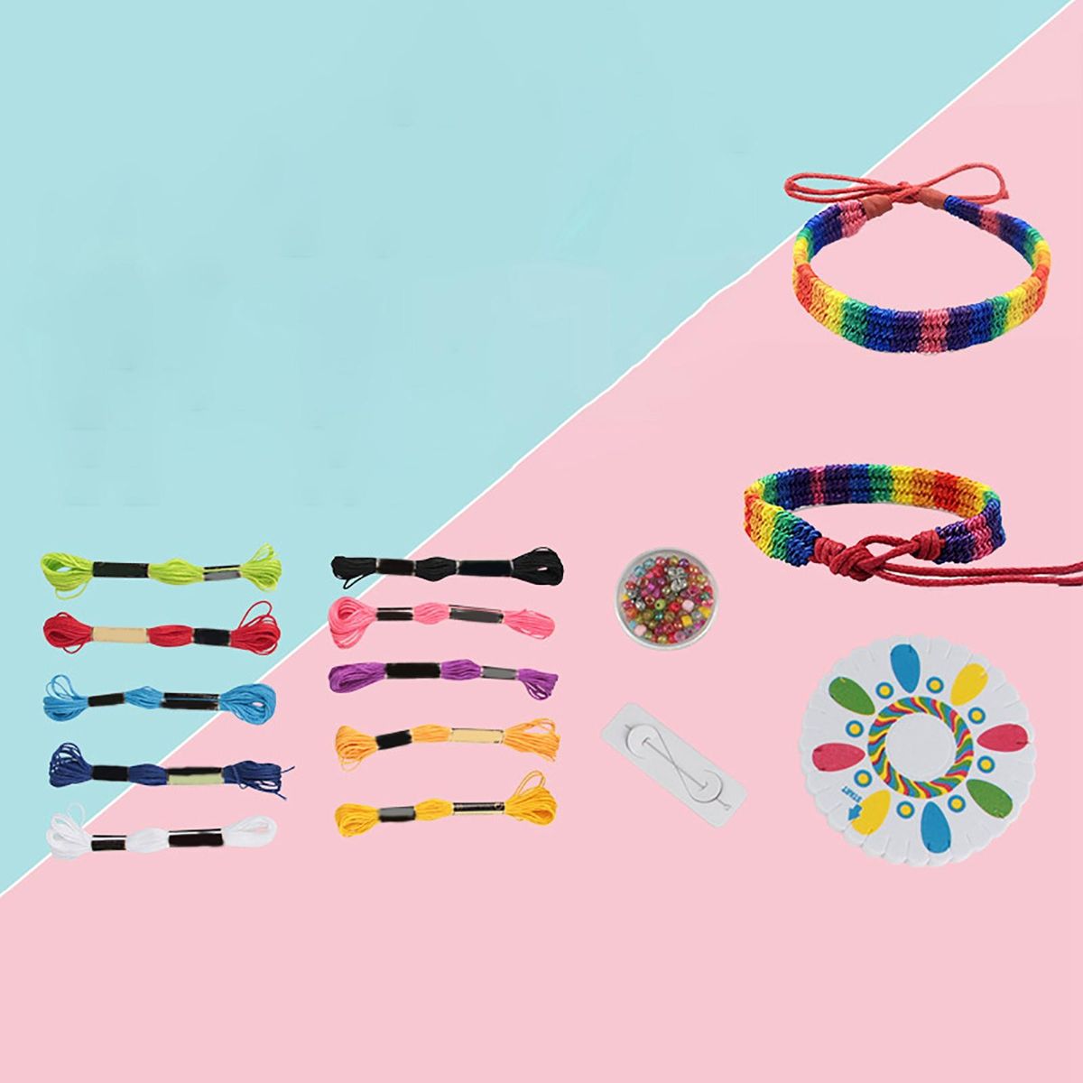 10 Piece round box colored beads, 1 Piece beading , 10Pieces colored cotton thread, 1 Piece round knitting board, 1 Piece square knitting board, 1 Piece instruction manual2 Piece Round box colored beads, 10 Pieces Colored cotton thread,2 Pieces Square woven board, 1Piece Special beading , 1Piece Instruction manual10 Pieces Round box colored beads, 2Pieces Crystal line, 1Piece Special beading , 1Piece Instruction manual10 Pieces Round box colored beads, 2Pieces Crystal line,1 Piece Special beading , 4 Piece Rubber band, 1 Piece Instruction manual