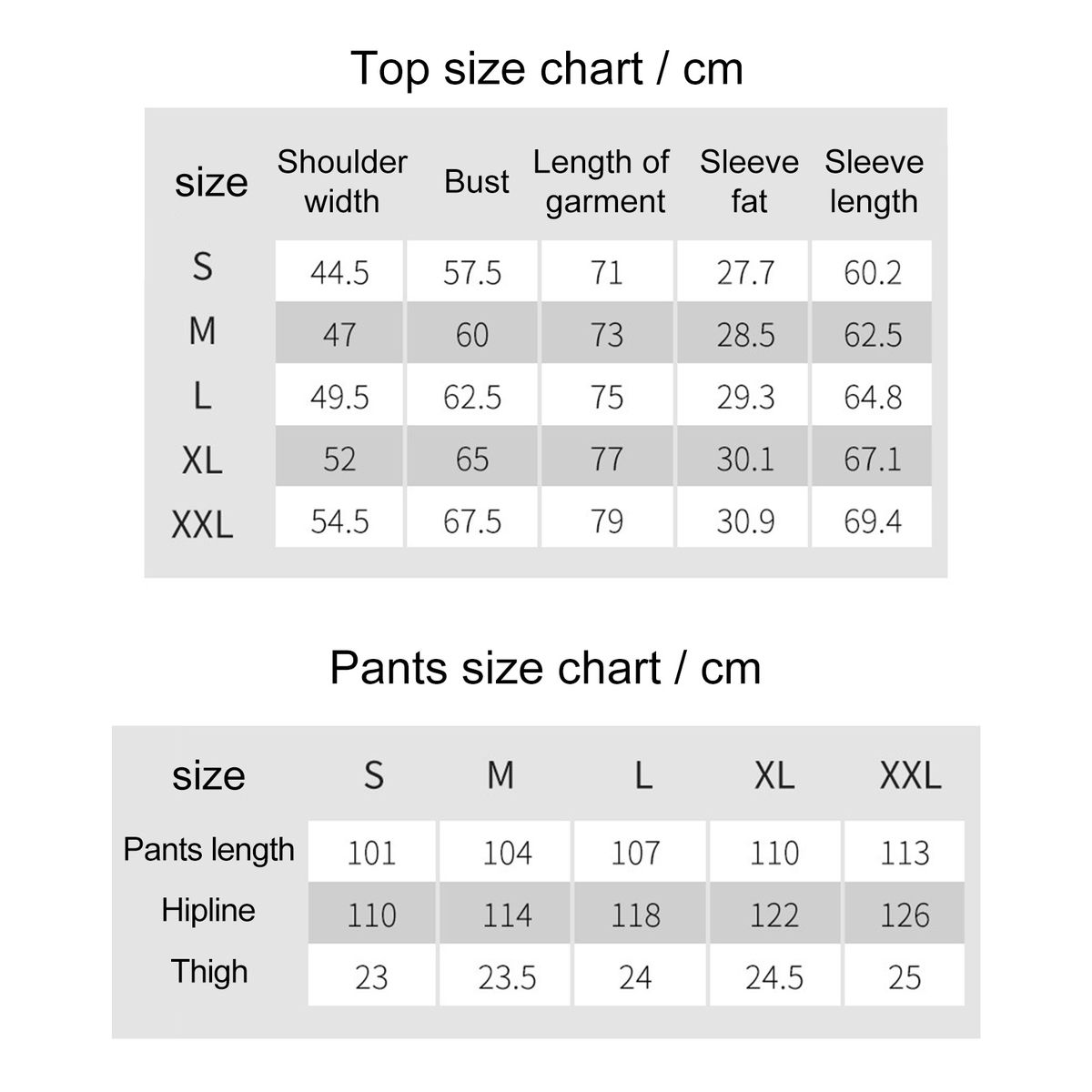 [Our Size XXL] Top Bust: 67.5cm/26.58", Sleeve Circumference: 30.9cm/12.17", Shoulder: 54.5cm/21.46", Sleeve: 69.4cm/27.32", Length: 79cm/31.10", Pants Length: 113cm/44.49", Hip: 126cm/49.61", Leg: 25cm/9.84" (Approx.)