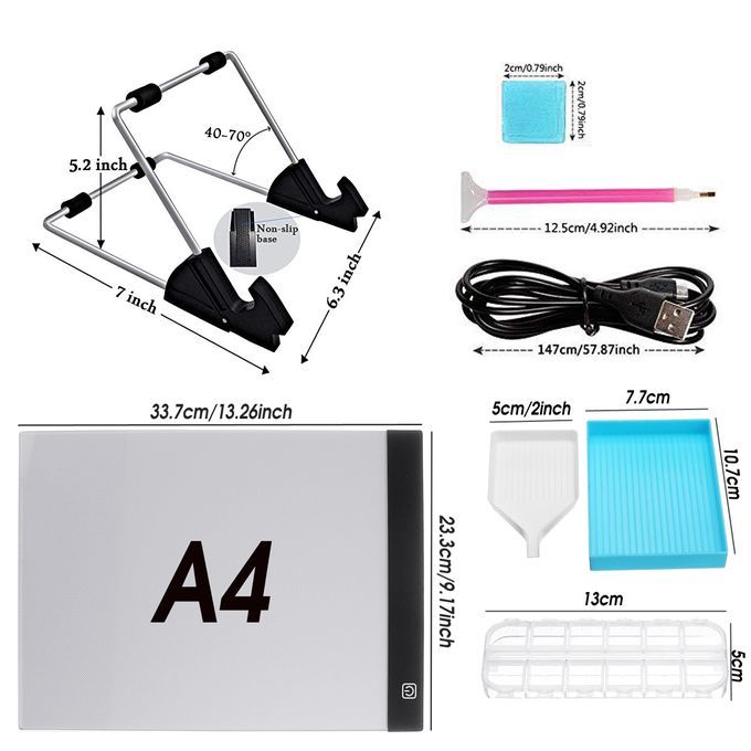 1 x LED Light Pad 1 x 1.5M USB Cable 1 x Holder 2 x Storage Box 1 x Clip 1 x Sticker 1 x Tweezer 3 x Pink Pen 1 x Correction Pen 10 x Binder 1 x Blue Box 1 x White Box 1 x User Manual