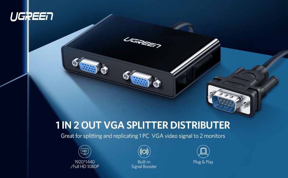 VGA splitter cable dual VGA monitor y cable 1 male to 2 female;VGA splitter dual monitor extended display;VGA splitter cable 1 computer to dual 2 monitors;VGA to HDMI splitter for 2 monitors;VGA video splitter for multiple monitors;mportant Notes: 1. The VGA splitter ONLY duplicates laptop/computer screen to displays/monitors/HDTVs. 【Mirror Mode only, NOT support Extend Mode】 2. It can only transfer signal from one source device to two displays/monitors/HDTVs with mirror mode. 3. Since the power output of some VGA conenctors are low, the VGA splitter box may not get sufficient power to work. when the LED indicator doesn't turn on, use a Micro USB cable to connect it with a DC 5V charger or USB port on PC for power supply.How it Works: This VGA splitter enables you to connect a VGA input device(laptop, PC, set-top box, blue-ray, etc.) to two VGA output display screen devices. And it only can deliver the same image. (TVs, displays, projectors, etc.) , supports 82ft long-distance transmission.Supports resolution up to 1920x1440 @60Hz, compatible with lower resolution, such as 1080P, 1600x1200, 1680x1050, 1066x900, etc. Supports VGA, SVGA, XVGA, UXGA. Bandwidth up to 250Mhz. Please note: this product not included the micro usb cord and power adapter.Intelligently Identify Resolution: VGA OUT 1 supports DDC, your computer will identify resolution of monitor and adjust to a suitable value which provides you an excellent visual experience. Note: VGA OUT 2 does not have this function.Durable Construction: thick nickel-plated connector withstands frequently plugging and unplugging and anti-corrosion; ABS case has a great heat resistance during working status.