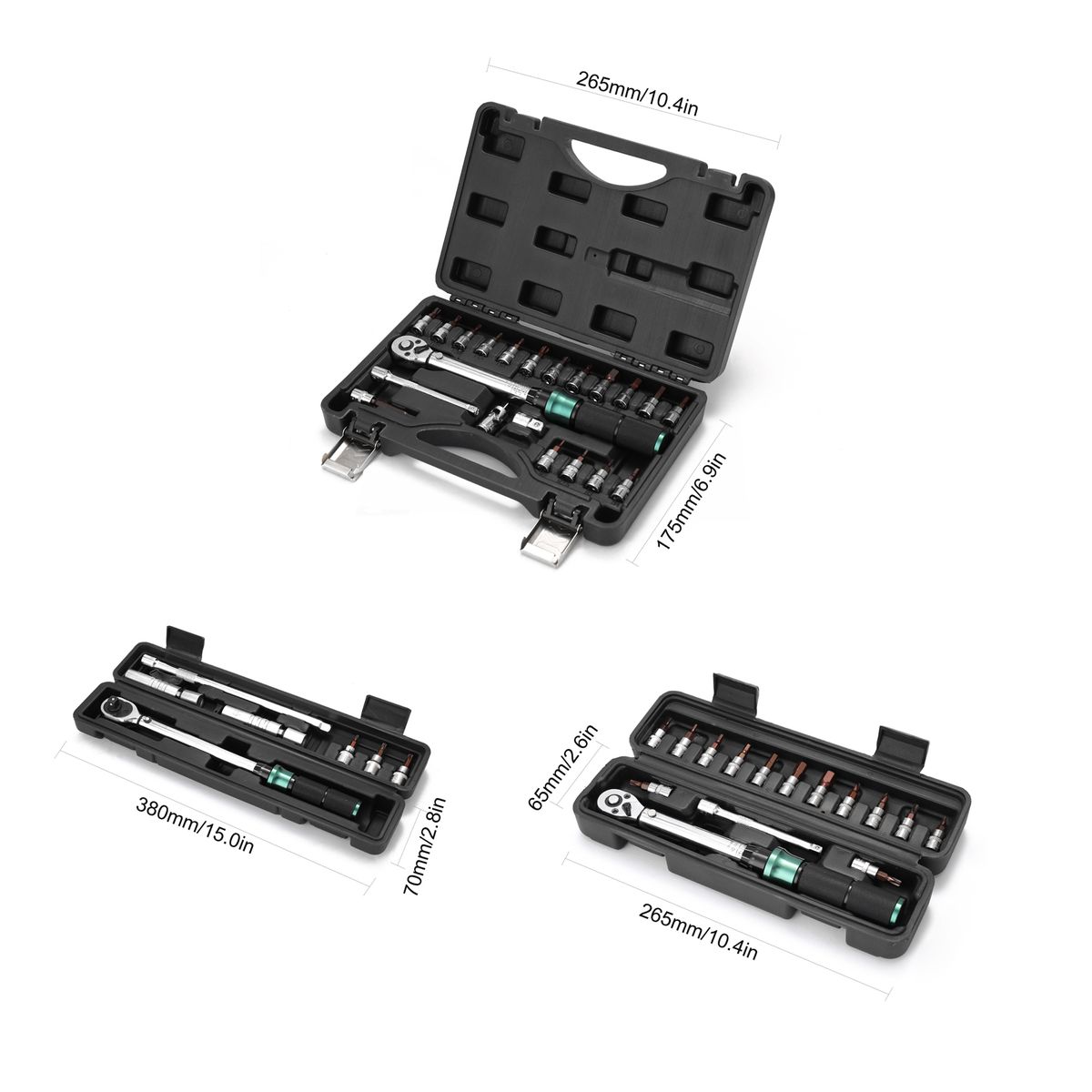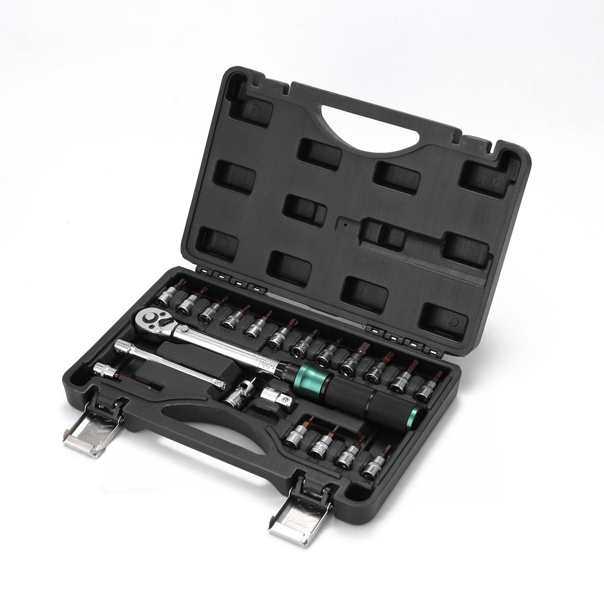 15PCS(1/4 Inch Drive): 1 * torque wrench (2-24N.m), 1 * connection rod, 13 * bits