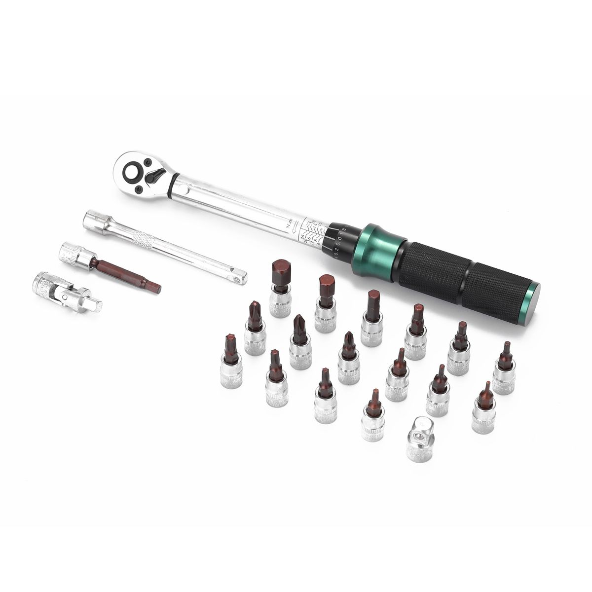 21PCS(1/4 Inch Drive): 1 * torque wrench (2-24N.m), 1* connection rod, 17 * bits, 2 * adapters